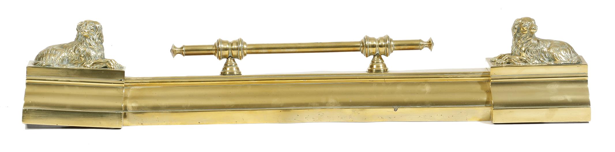 A Victorian adjustable brass fender, decorated with recumbent spaniels, 106cm wide (extended).