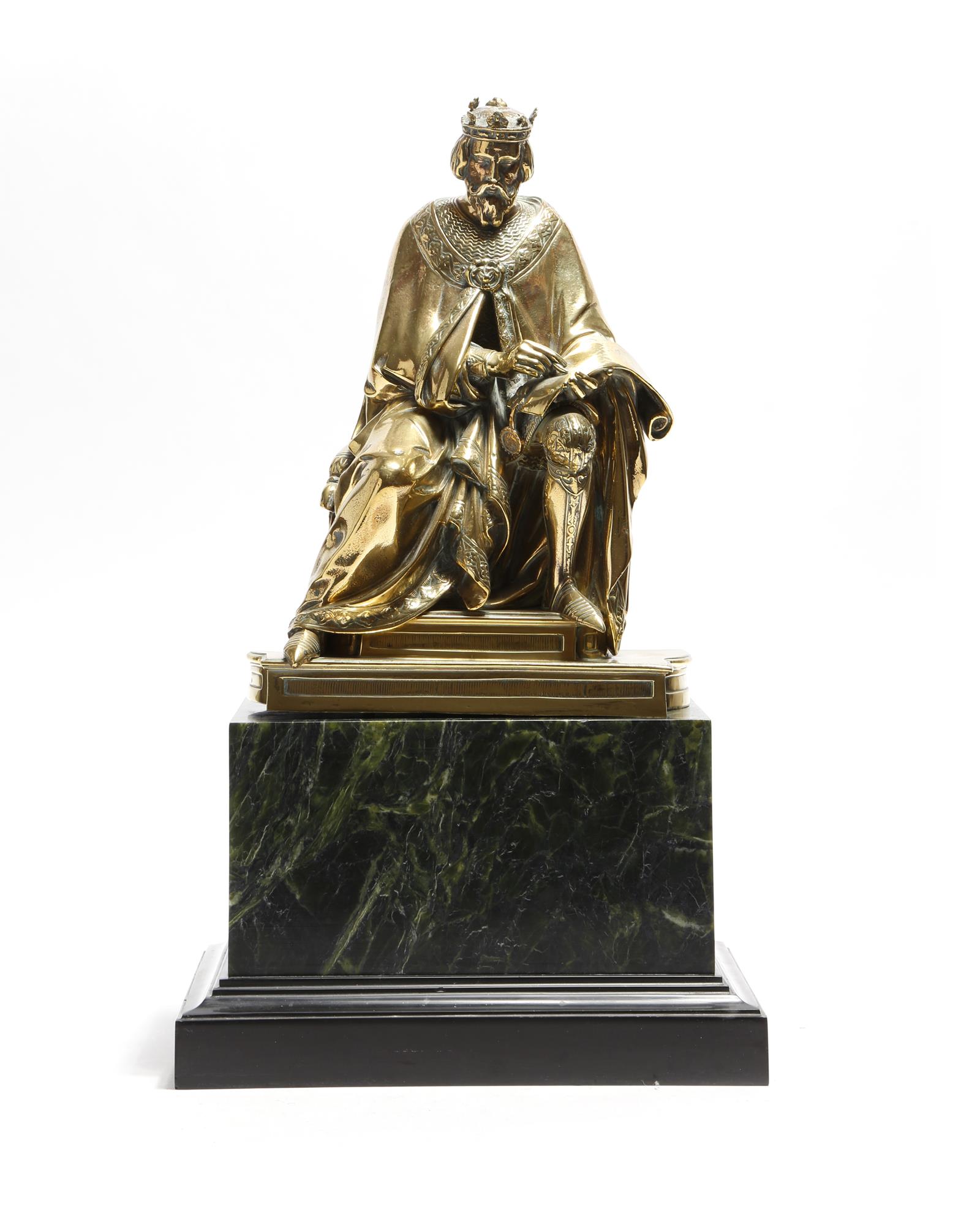 After Francois-Theodore Devaulx (French 1808-1870). A late Victorian brass model of King John, seated, signing the Magna Carta, 33.5cm high, on a green and black marble plinth.
