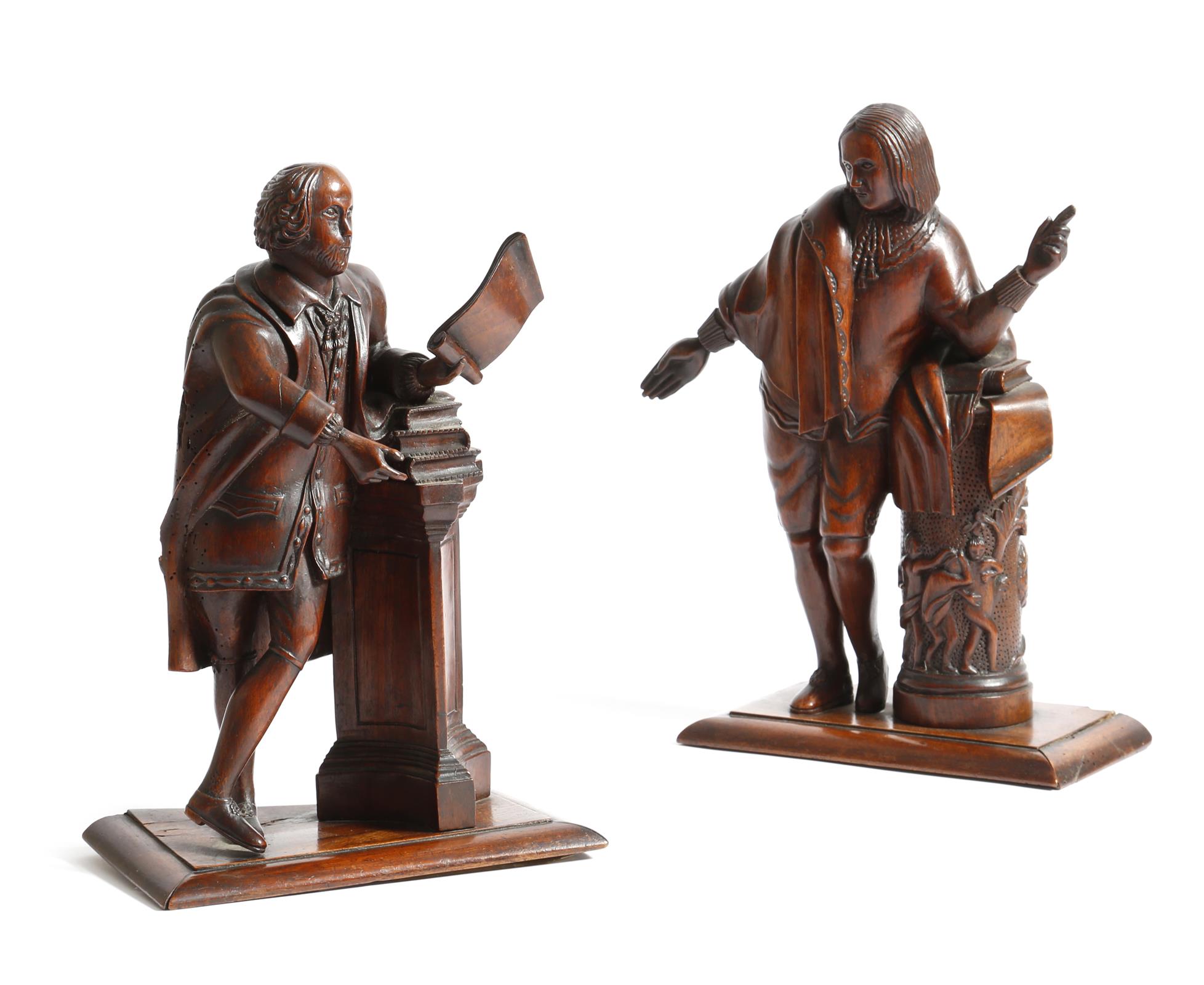 A pair of George III carved treen figures of Shakespeare and Milton in the manner of Salsbee, possibly mulberry wood, depicting the bard leaning on a pile of books on a concave pedestal, Milton also leaning on a book and scroll strewn pedestal relief carved with Adam and Eve being chased by a fallen angel, the base of Shakespeare with two printed labels, one inscribed 'The statuettes alleged to be carved from the wood of Shakespeare's mulberry-tree ......among the most attractive of the archaic carvings by Salsbee (1761)', 34cm high (max). (2)