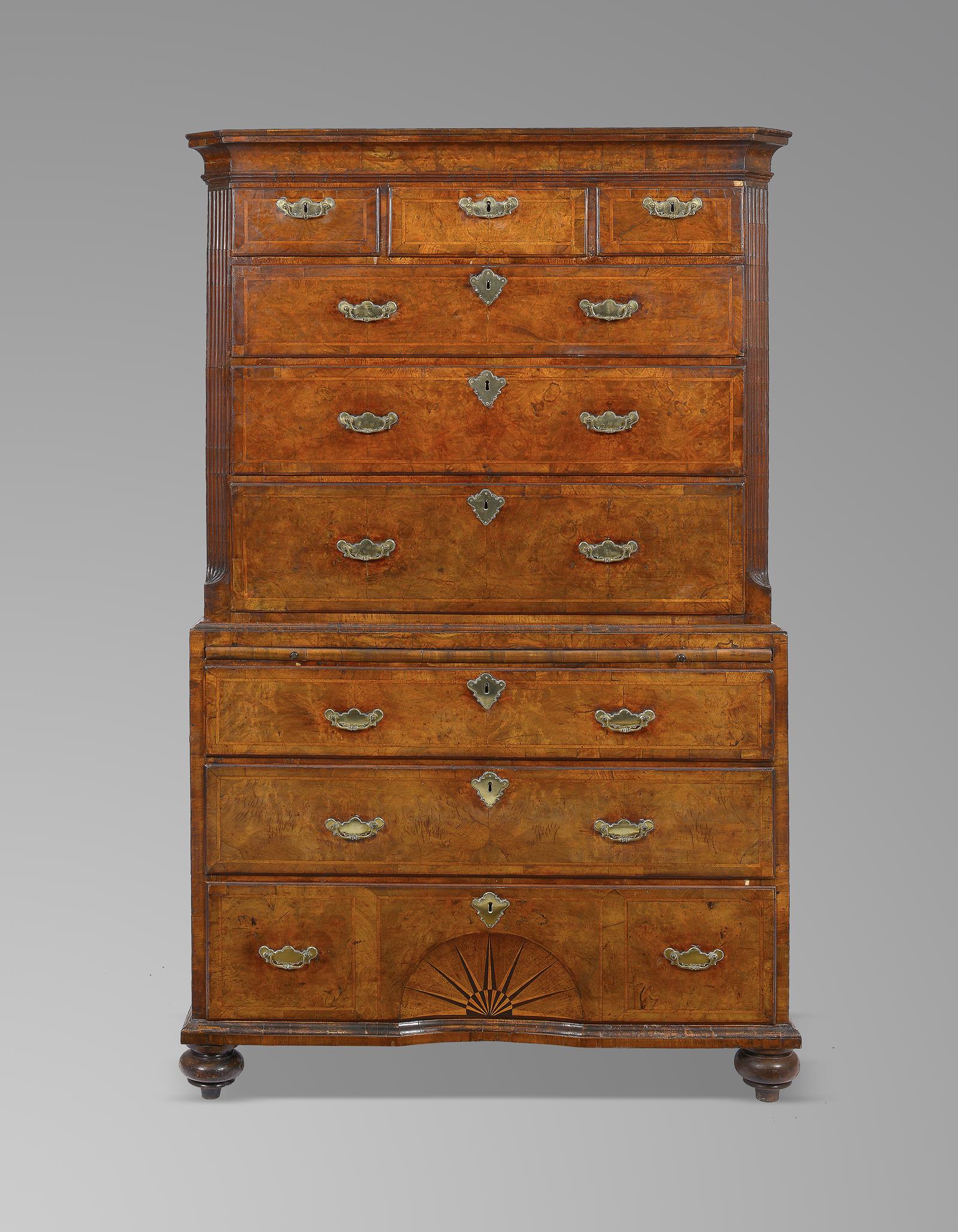 A George I walnut chest on chest, the moulded cornice above three short and two long cross and feather banded burr veneered drawers flanked by fluted angles, above a brushing slide and three long conforming drawers, the lowest one with a parquetry inlaid sunburst concave panel, on bun feet, 181.3cm high, 104.8cm wide, 55cm deep.