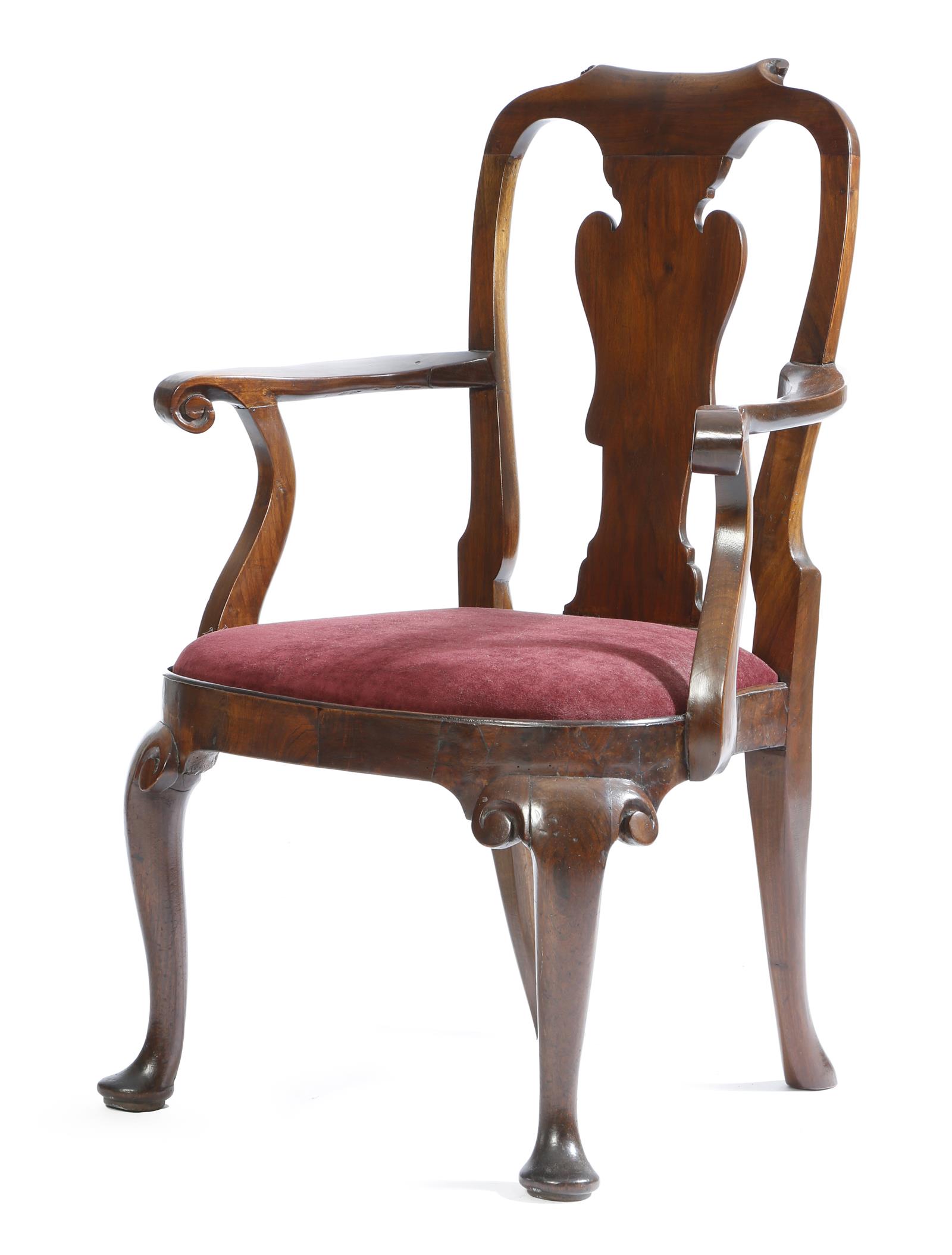 A George II walnut open armchair, with a solid splat and scroll arms, above a drop-in bell shaped seat, on scroll eared cabriole front legs and pad feet.