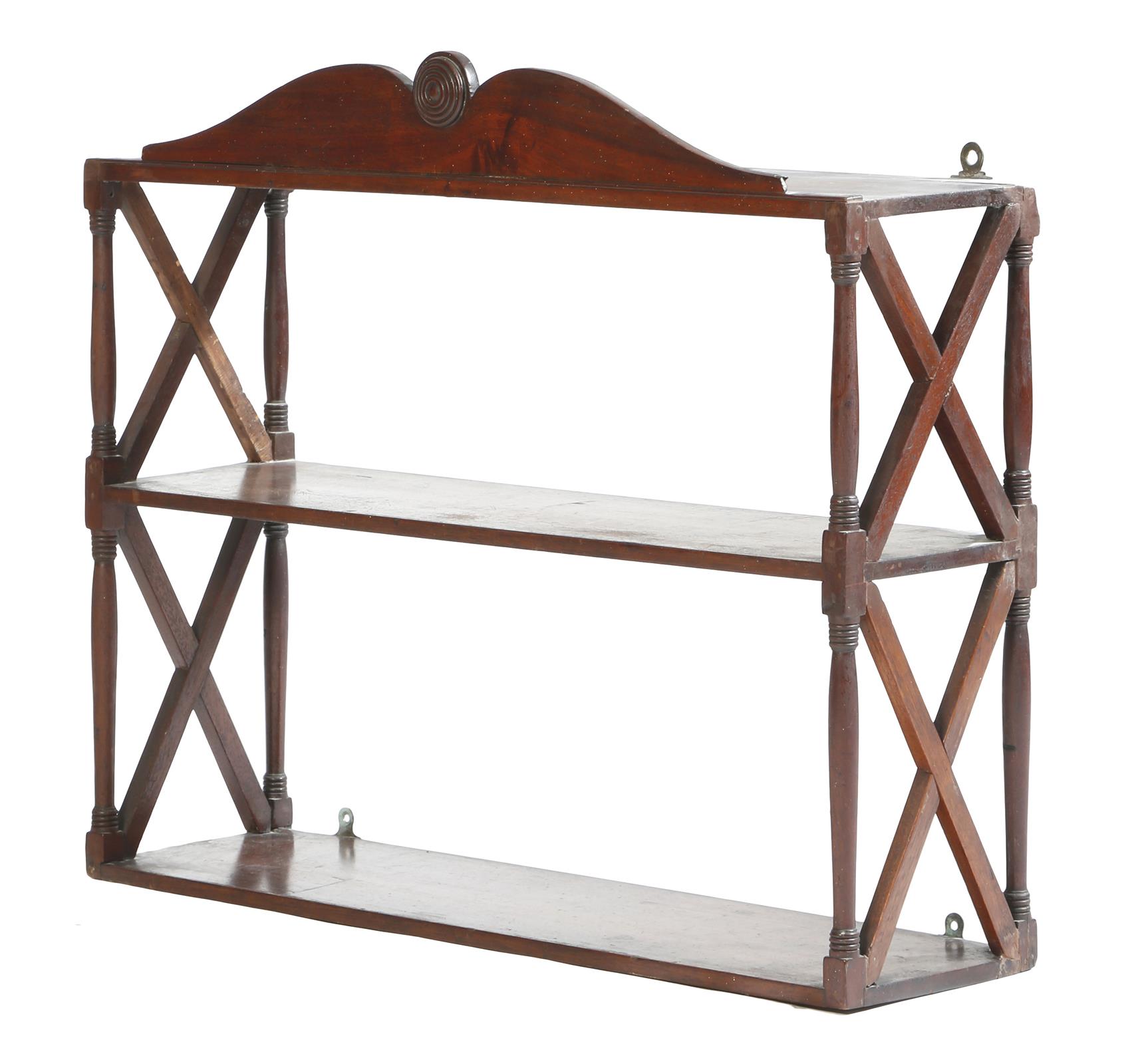 A set of Regency mahogany hanging wall shelves, the shaped top centred with a reeded rondel, with 'X' shaped ends and ring turned supports, 56.9cm high, 68.5cm wide, 17.7cm deep.