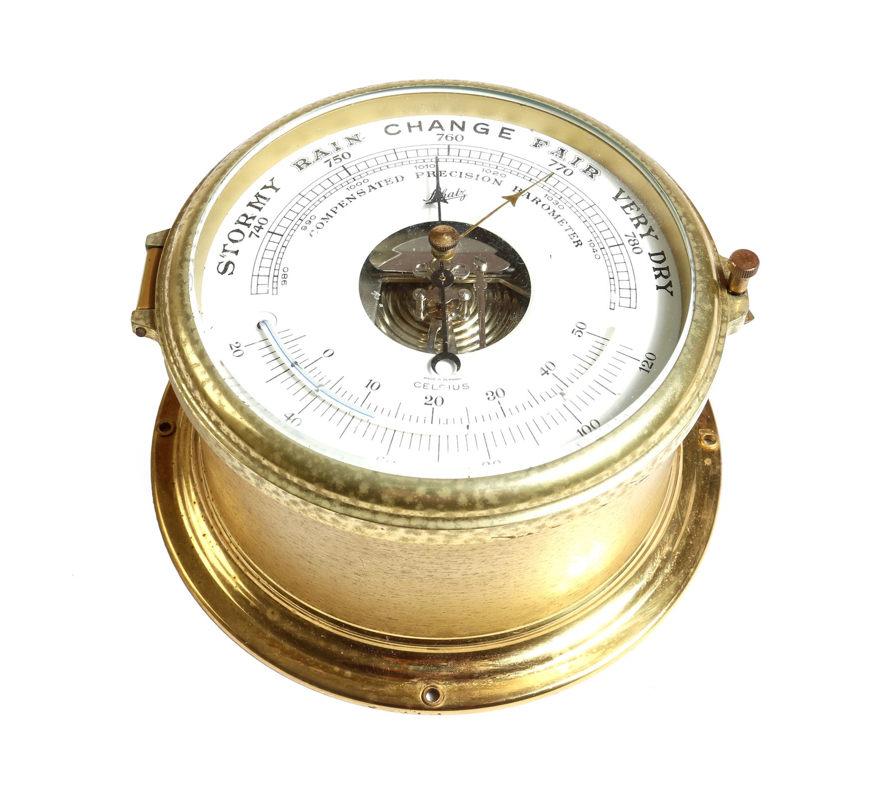 A German brass cased bulkhead style aneroid barometer by Schatz