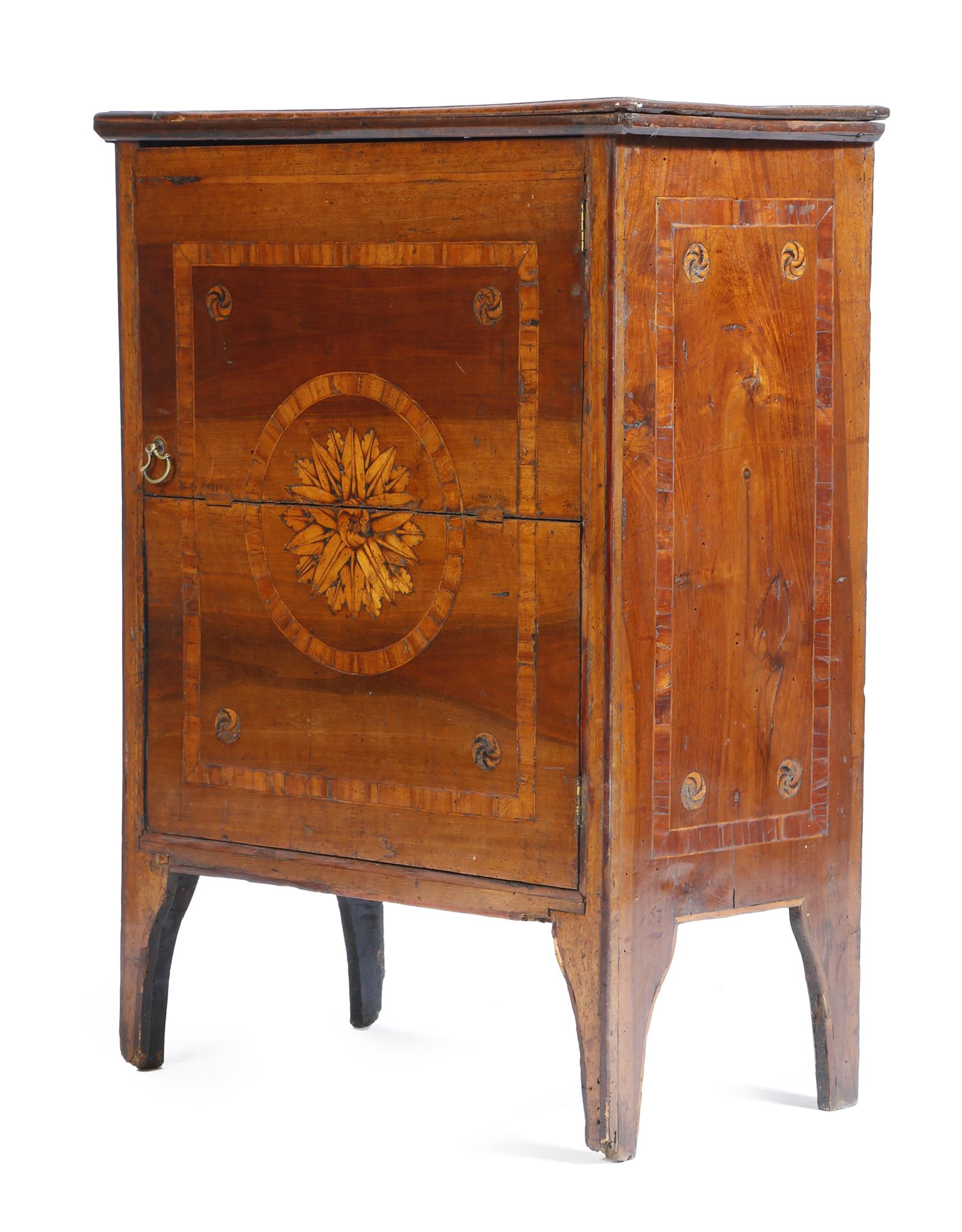 A late 18th century Italian walnut commodino, the formerly hinged top inlaid with banding and rondels, above a conforming cupboard door, marquetry inlaid with a foliate patera enclosing a shelf, 85.9cm high, 62.8cm wide, 33.7cm deep.
