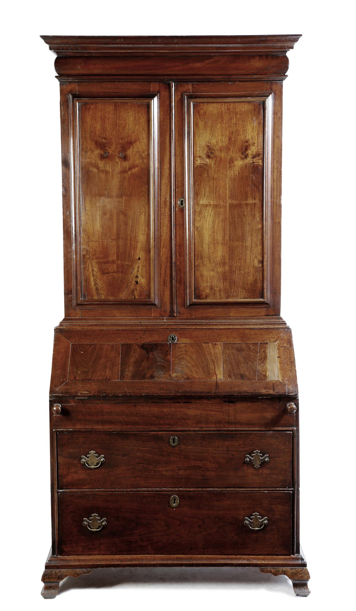 An 18th century walnut bureau bookcase, with a pair of raised panel doors enclosing a compartmented interior, above a hinged fall, with a stepped interior of drawers and pigeon holes, with a sliding well cover and a later baize lined writing surface, above two long drawers, on ogee bracket feet, 208.2cm high, 100.2cm wide, 56.3cm deep.