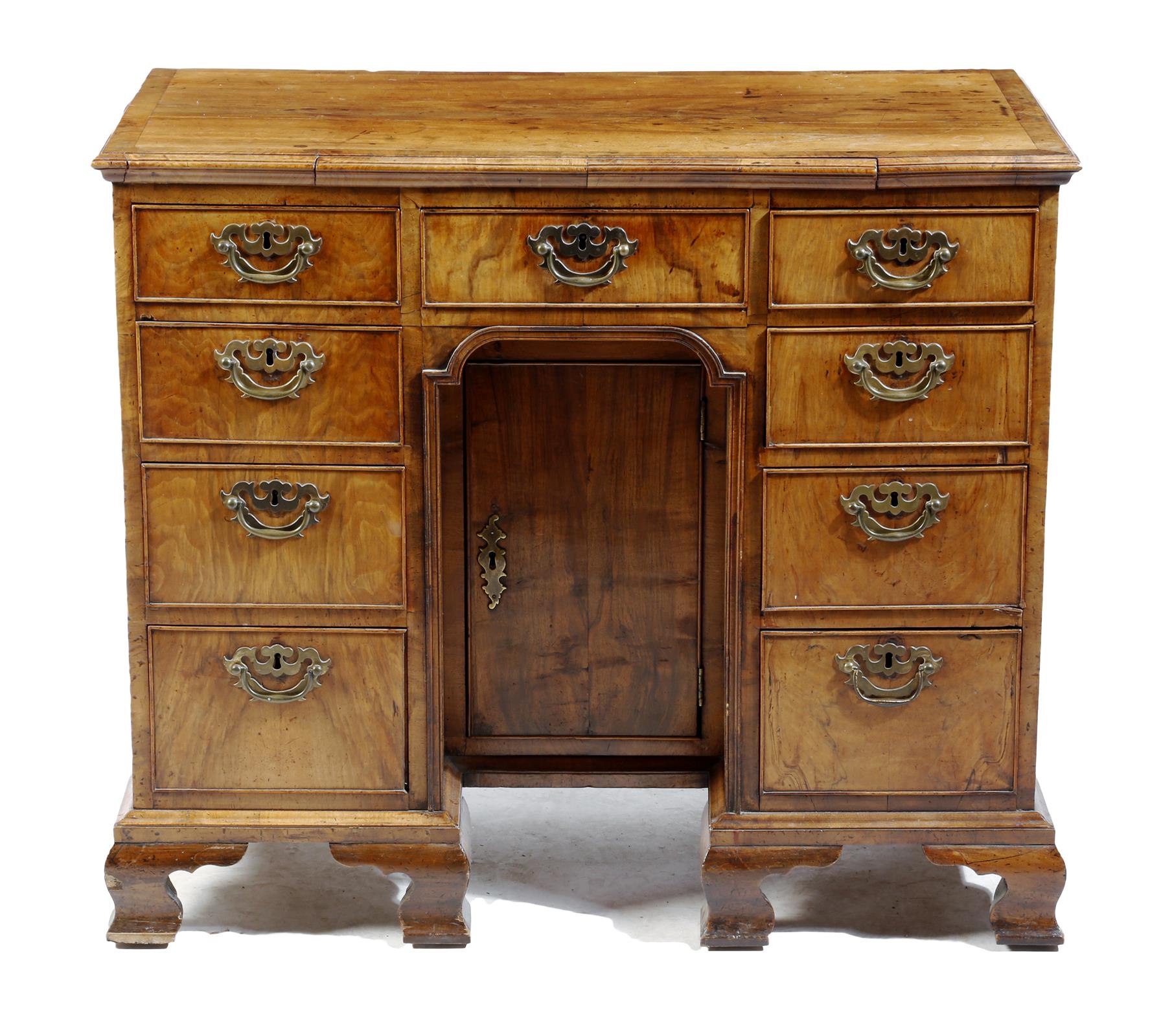 A George II and later walnut kneehole desk, the crossbanded top with a moulded edge, above an arrangement of nine drawers, with brass bat's wing handles, with a central cupboard door enclosing a shelf, on ogee bracket feet, 76.5cm high, 90.5cm wide, 46.5cm deep.
