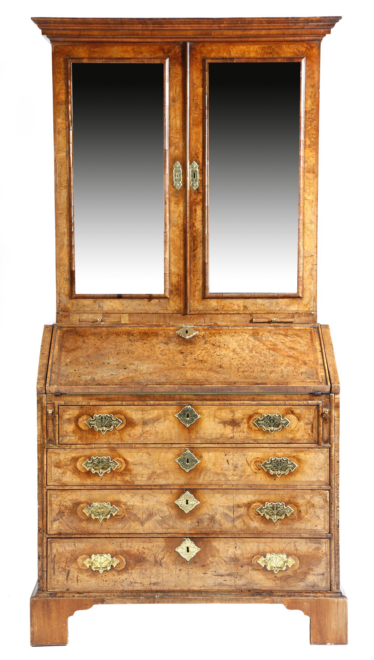 A George I walnut and burr walnut bureau cabinet, cross and feather banded, the moulded cornice above a a pair of mirrored doors, enclosing two shelves, above pull-out candle slides, the hinged fall revealing an interior fitted with pigeon holes and drawers, with a sliding well cover, above four long graduated drawers, on later bracket feet, 195cm high, 97.8cm wide, 59.6cm deep.