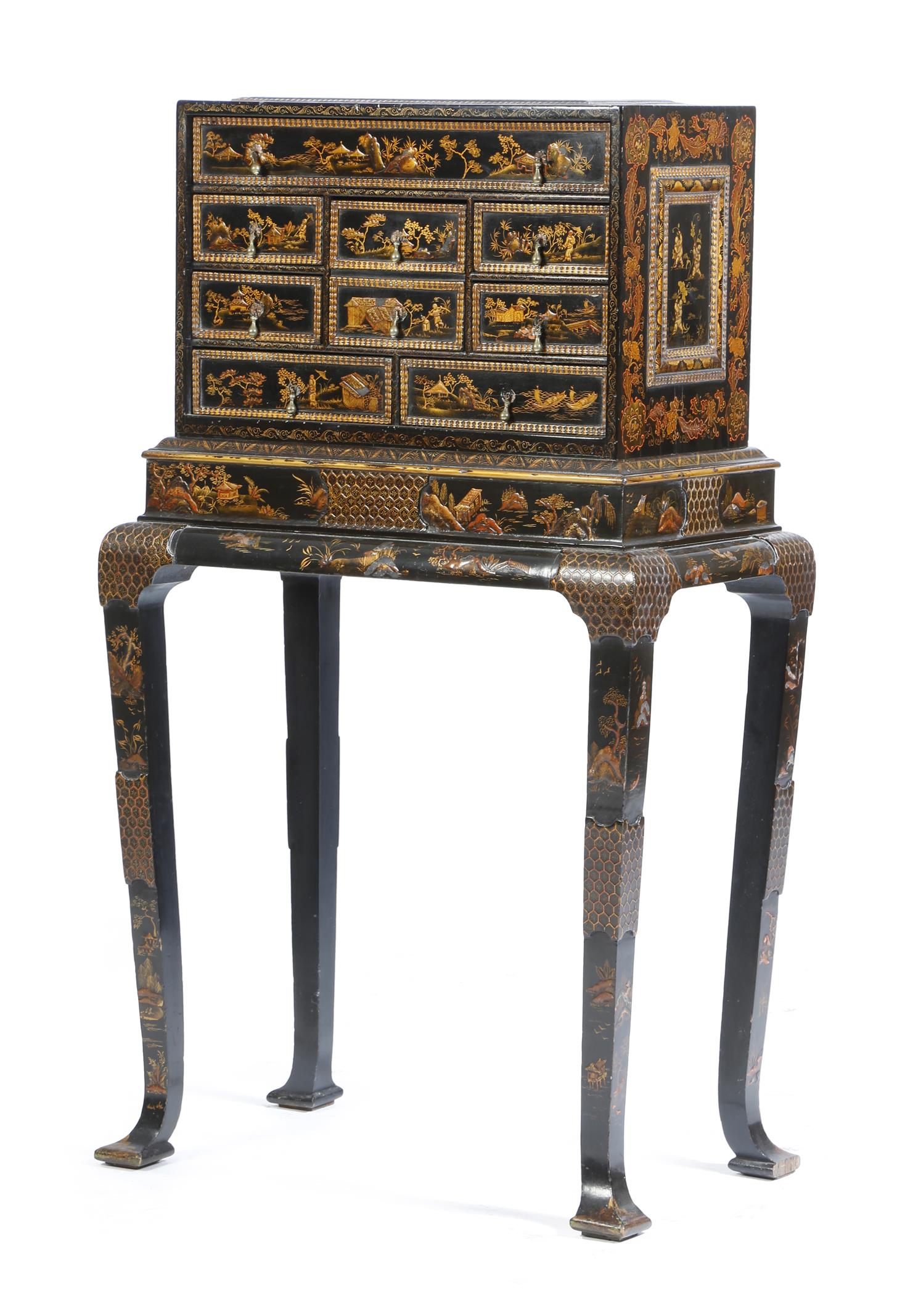 A black and gilt lacquered cabinet on stand in 18th century style, decorated with chinoiserie, with oriental figures, in watery landscapes, with dragons, buildings, trees and bridges, with diaper panels, the cabinet with an arrangement of eight drawers, on square section cabriole legs and pad feet, 103.2cm high, 59cm wide, 36cm deep.