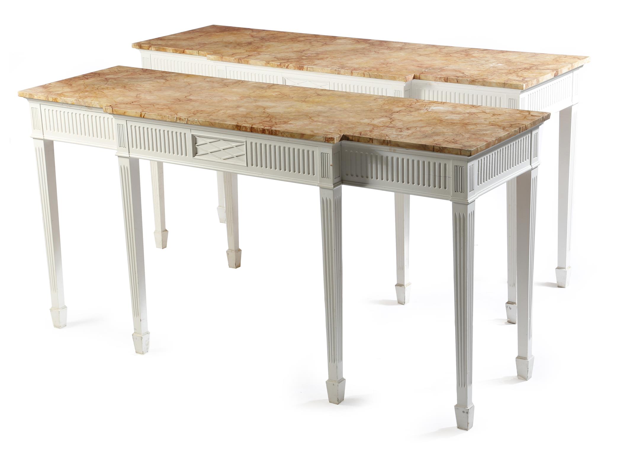 A pair of white painted breakfront side tables in George III style by John Sander, each with a faux marble top, above a fluted and lattice panelled frieze, on square tapering legs and spade feet, c.1966, 84cm high, 168.4cm wide, 54.5cm deep. (2)