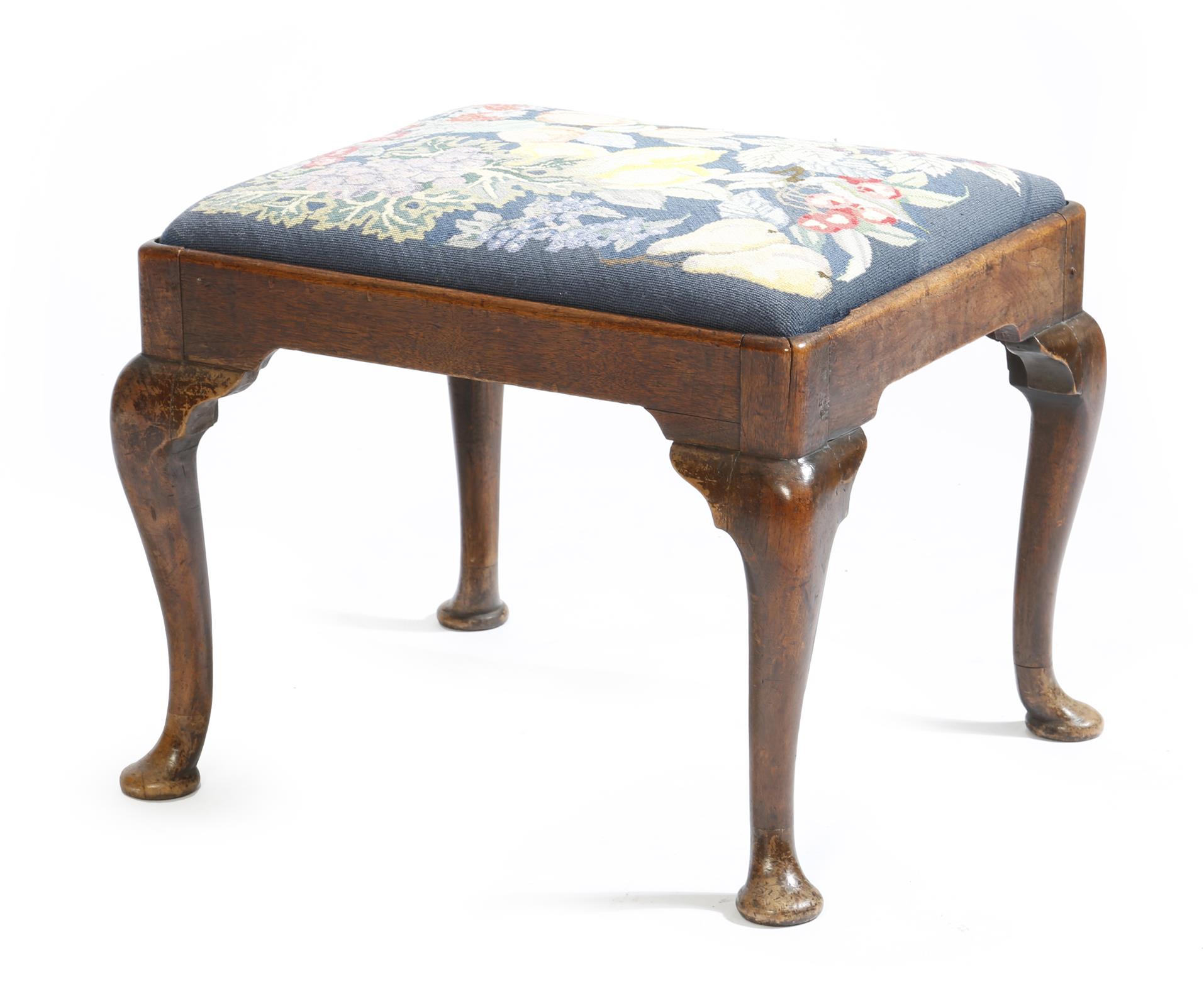 A George II mahogany stool, with a later needlework drop-in seat decorated with fruit, on cabriole legs and cut pad feet, 46.7cm high, 57.7cm wide, 49.2cm deep.