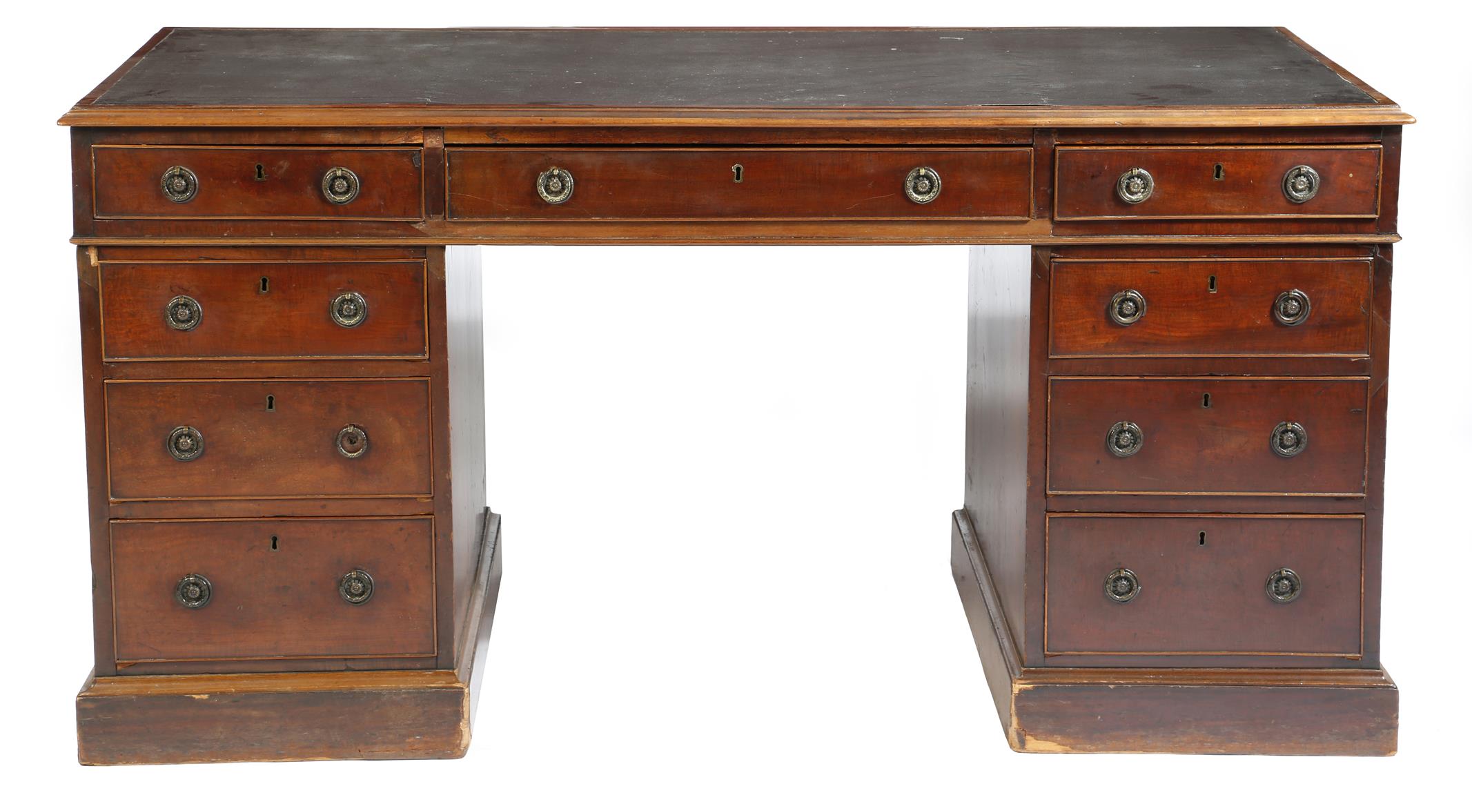 A George IV mahogany twin pedestal desk, the top with a moulded edge and inset with tooled leatherette, above an arrangement of nine drawers, the pedestals with outline mouldings, 75.6cm high, 155.1cm wide, 75.2cm deep.