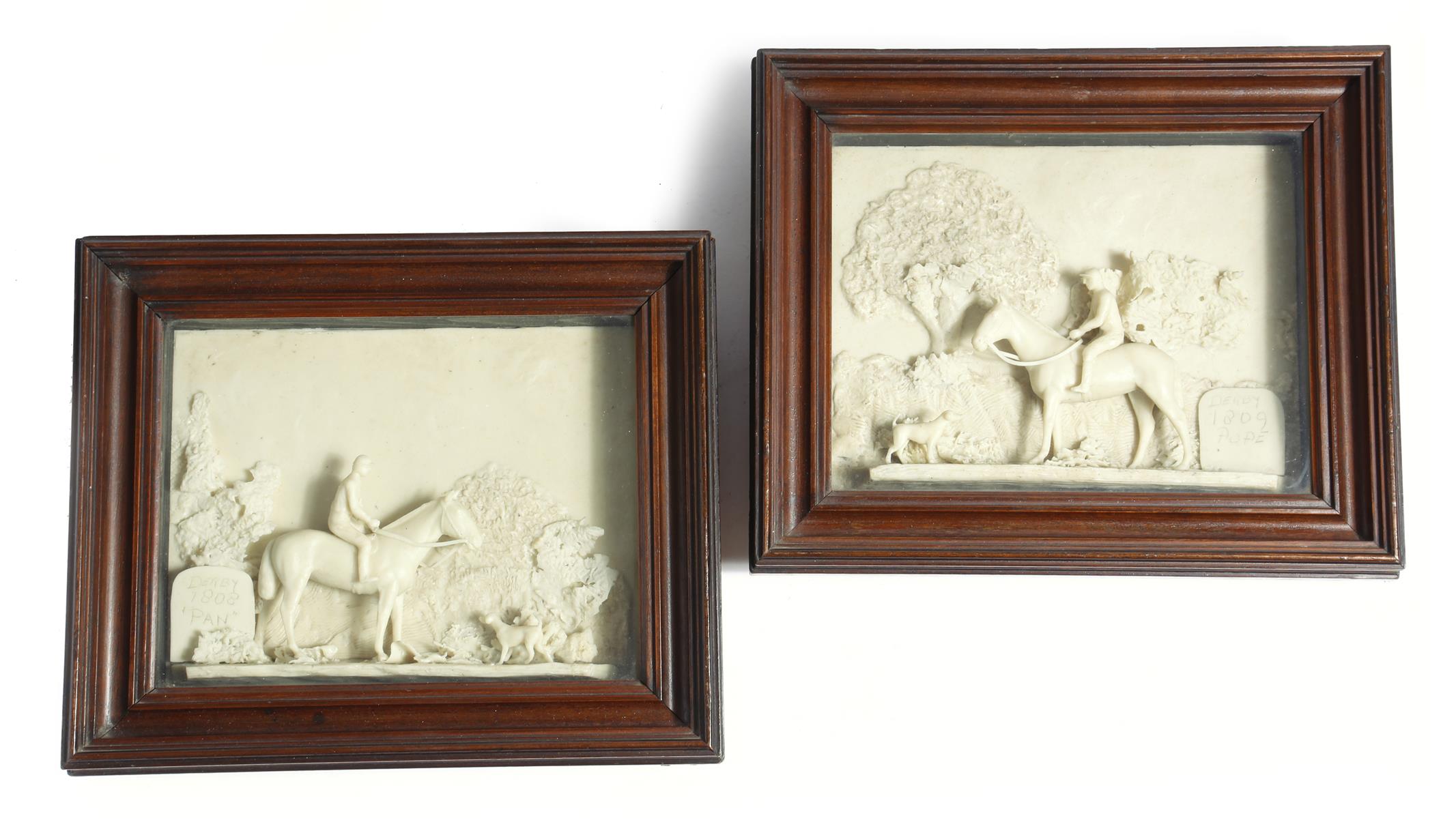 A pair of 19th century equestrian wax dioramas, depicting the horses 'Pan' and 'Pope', with riders, accompanied by dogs, in naturalistic landscapes, each inscribed 'DERBY 1808 PAN' and 'DERBY 1809 POPE', 16.5 x 21.5cm, each in a glazed mahogany moulded frame. (2)