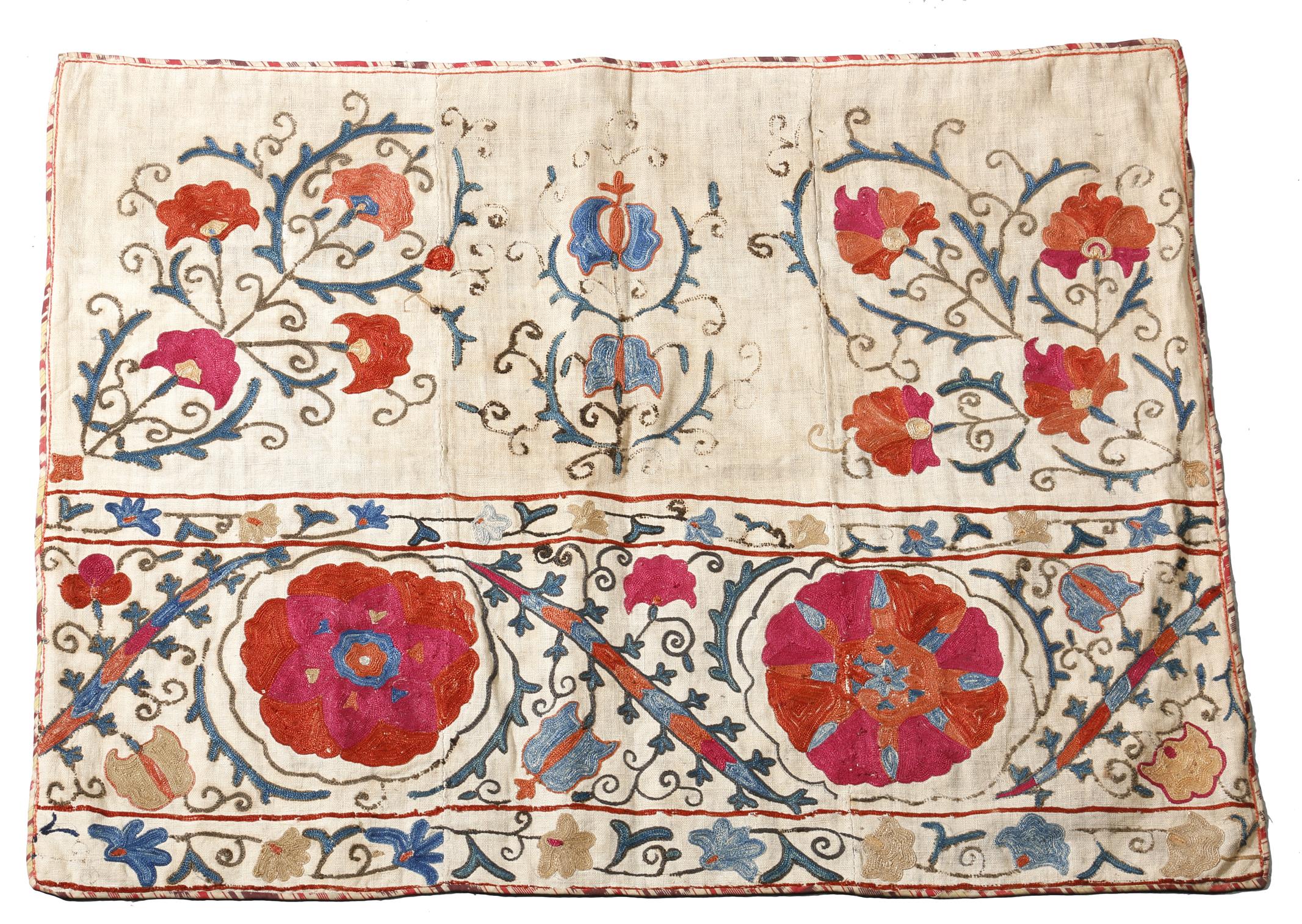 A Suzani fragment, embroidered with flowers and leaves on a cotton ground, with a later backing, Uzbekistan, 19th century, 64 x 81.5cm.