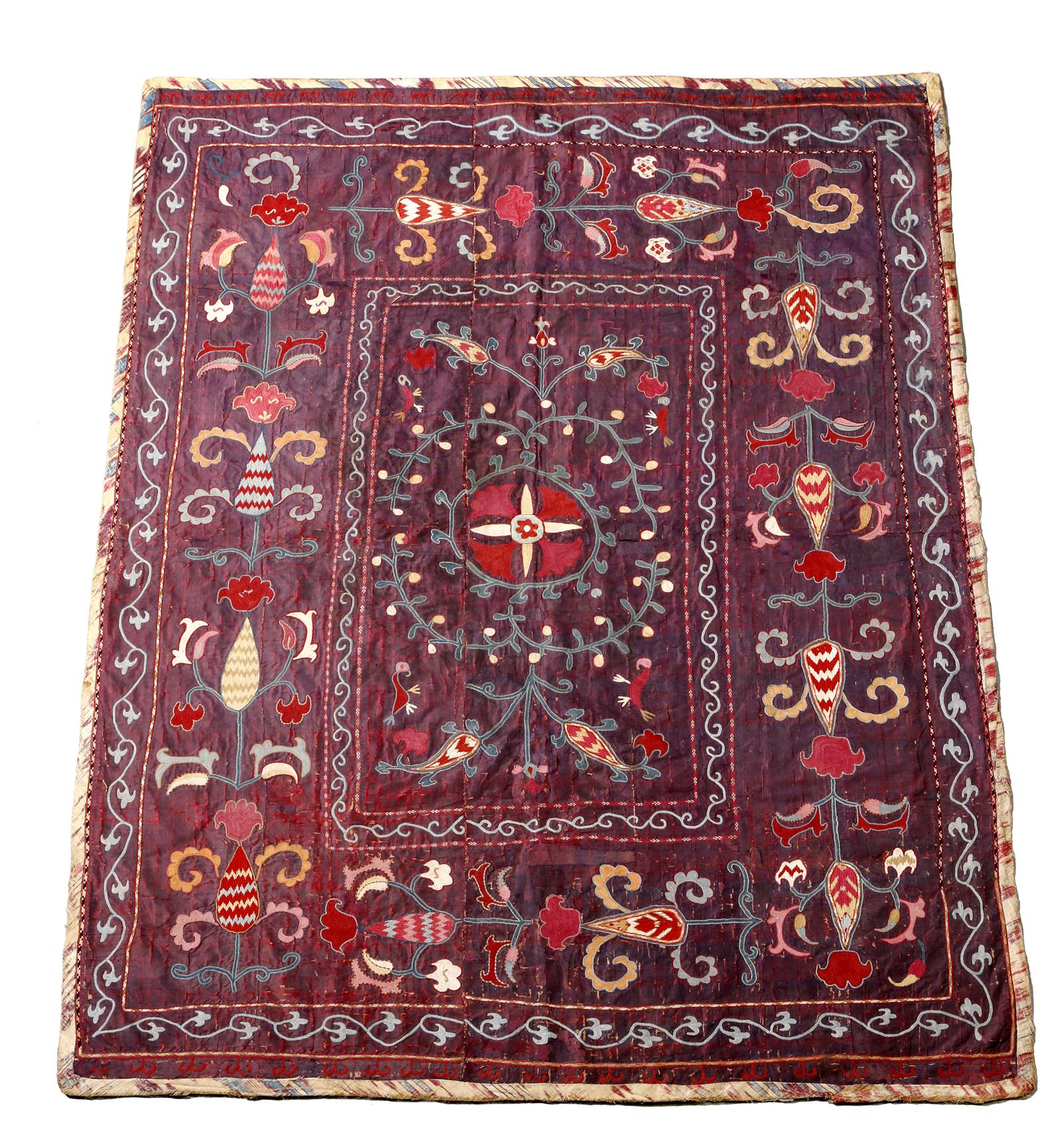 A 19th century Ferghana valley Suzani, silk embroidered with flowers and birds on a plum coloured silk ground, with a later backing, Uzbekistan, 145 x 112cm.
