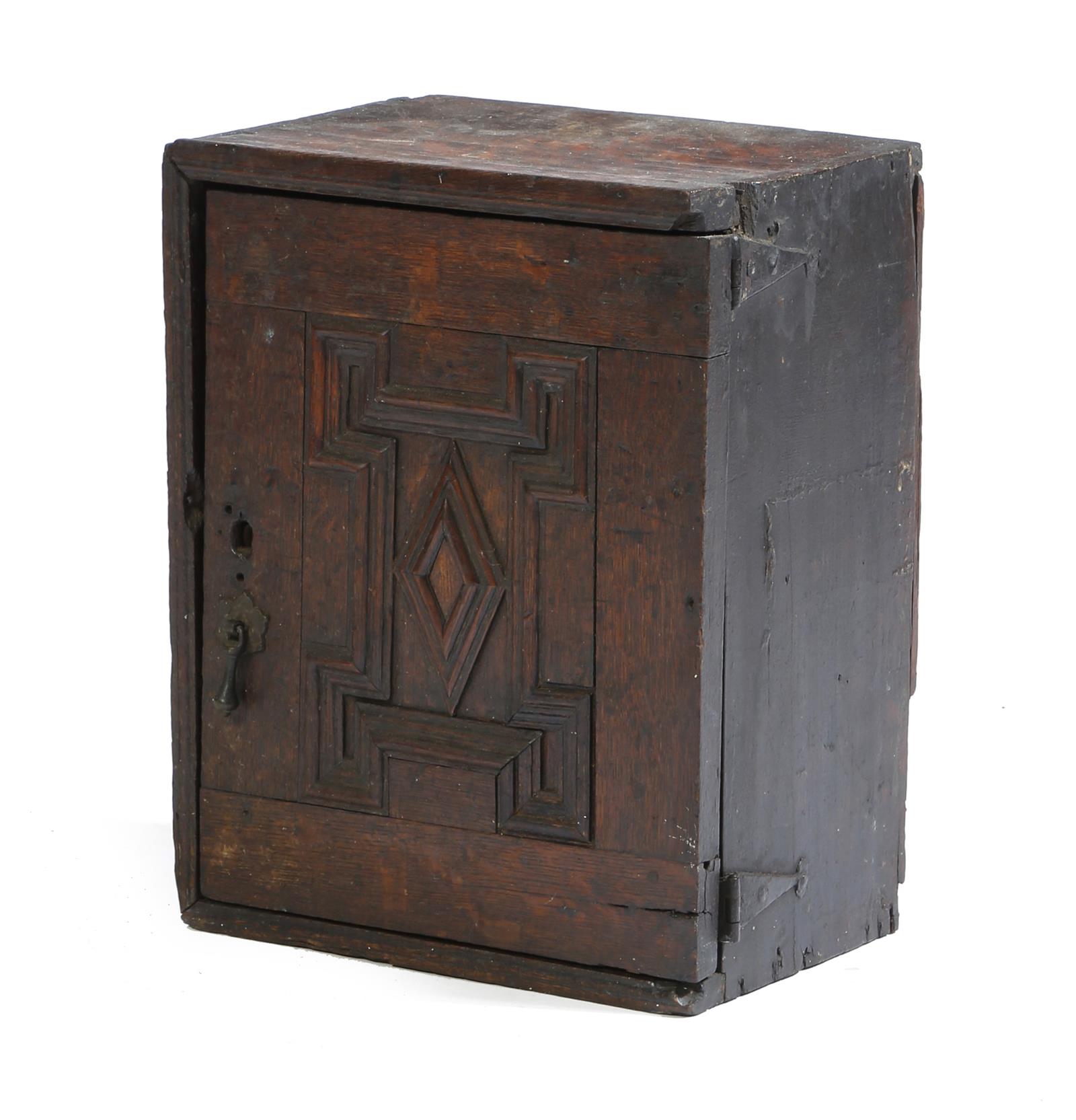 A William and Mary oak spice cupboard, the geometric moulded panelled door enclosing an arrangement of eight drawers, 36.4cm high, 28cm wide, 19.5cm deep.