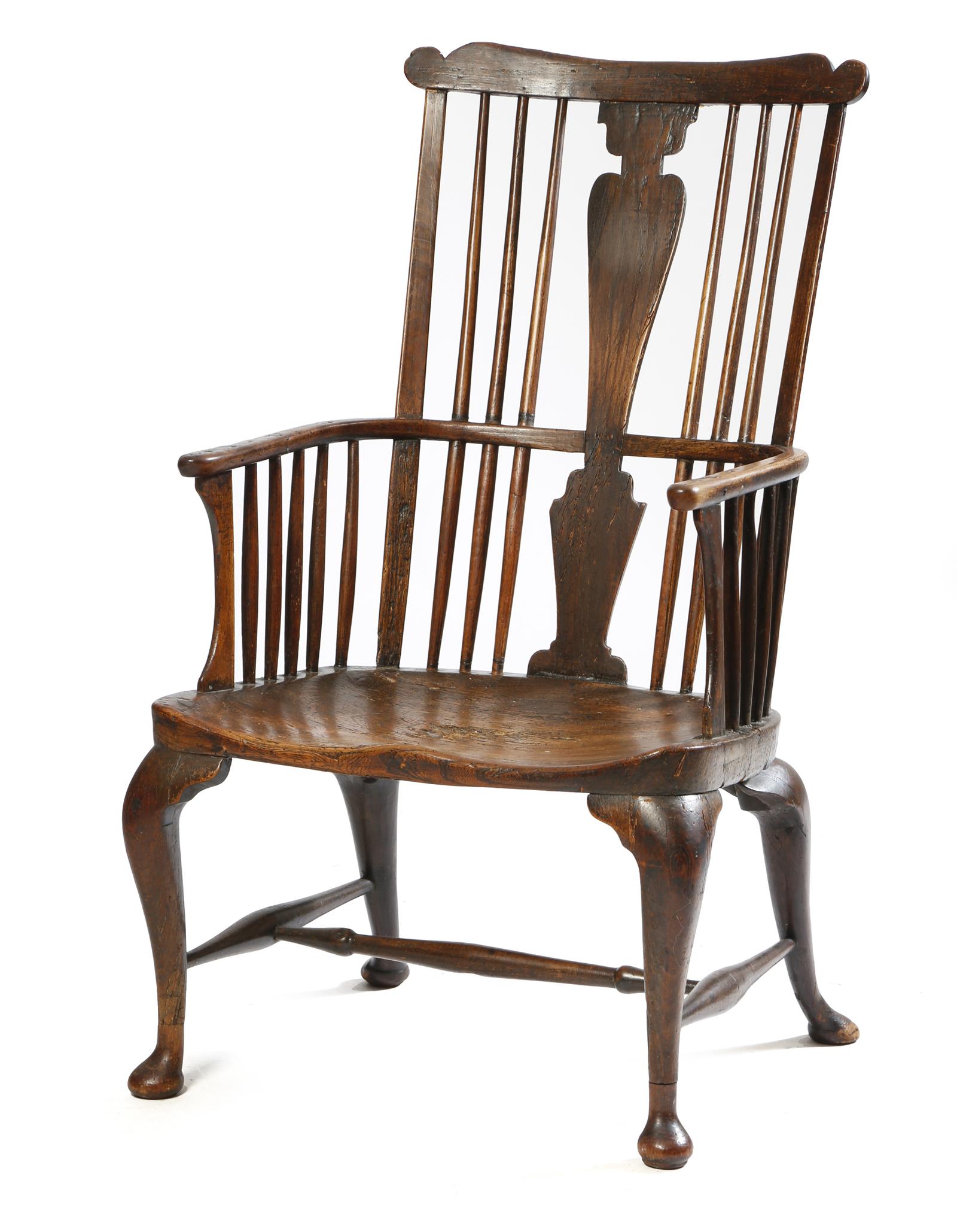 A mid-18th century fruitwood and ash Windsor armchair attributed to John Pitt, the comb back above a solid vase shape splat, with concave arm supports, above a solid elm seat, on cabriole legs and pad feet united by turned stretchers.
