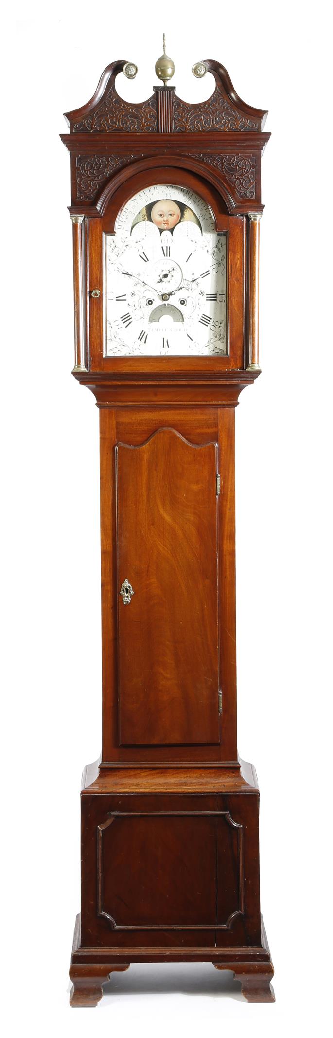 A George III mahogany longcase clock by George Quarman Bristol, the eight day movement with an anchor escapement and four turned pillars striking on a bell, the 12 1/8in silvered arched dial with Roman and Arabic numerals, with subsidiary seconds dial and date aperture, with engraved flowers and inscribed 'GEORGE QUARMAN TEMPLE CLOUD', the arch with a painted moonphase and inscribed 'HIGH WATER AT BRISTOL KEY', the hood with a swan neck pediment and brass urn finial with blind fretwork decoration, with a shaped trunk door and outline mouldings, with presentation plaque to inside of trunk door, 241cm high.
