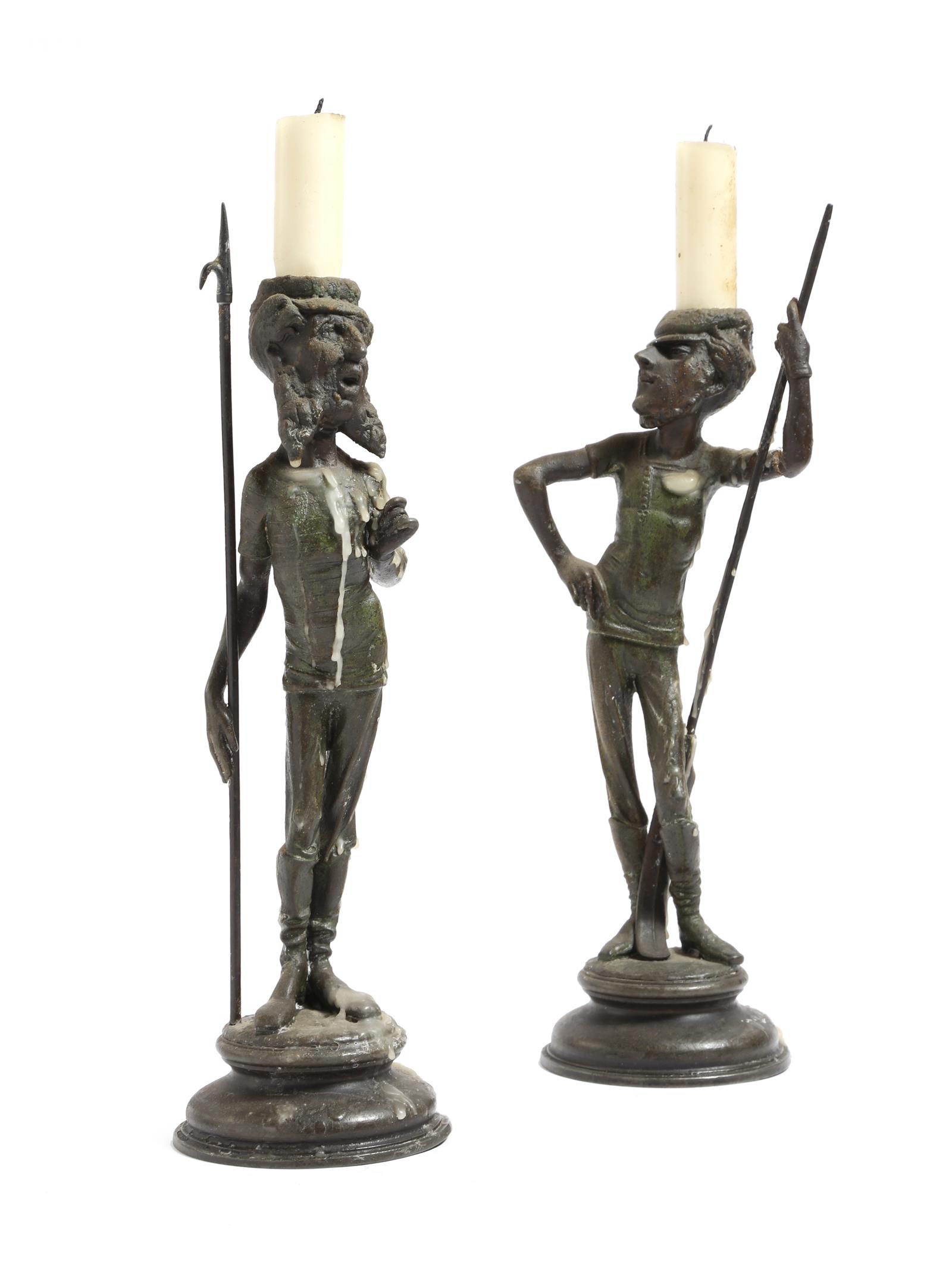 After Eugene Guillaume (French 1822-1905). A pair of patinated spelter figural candlesticks
