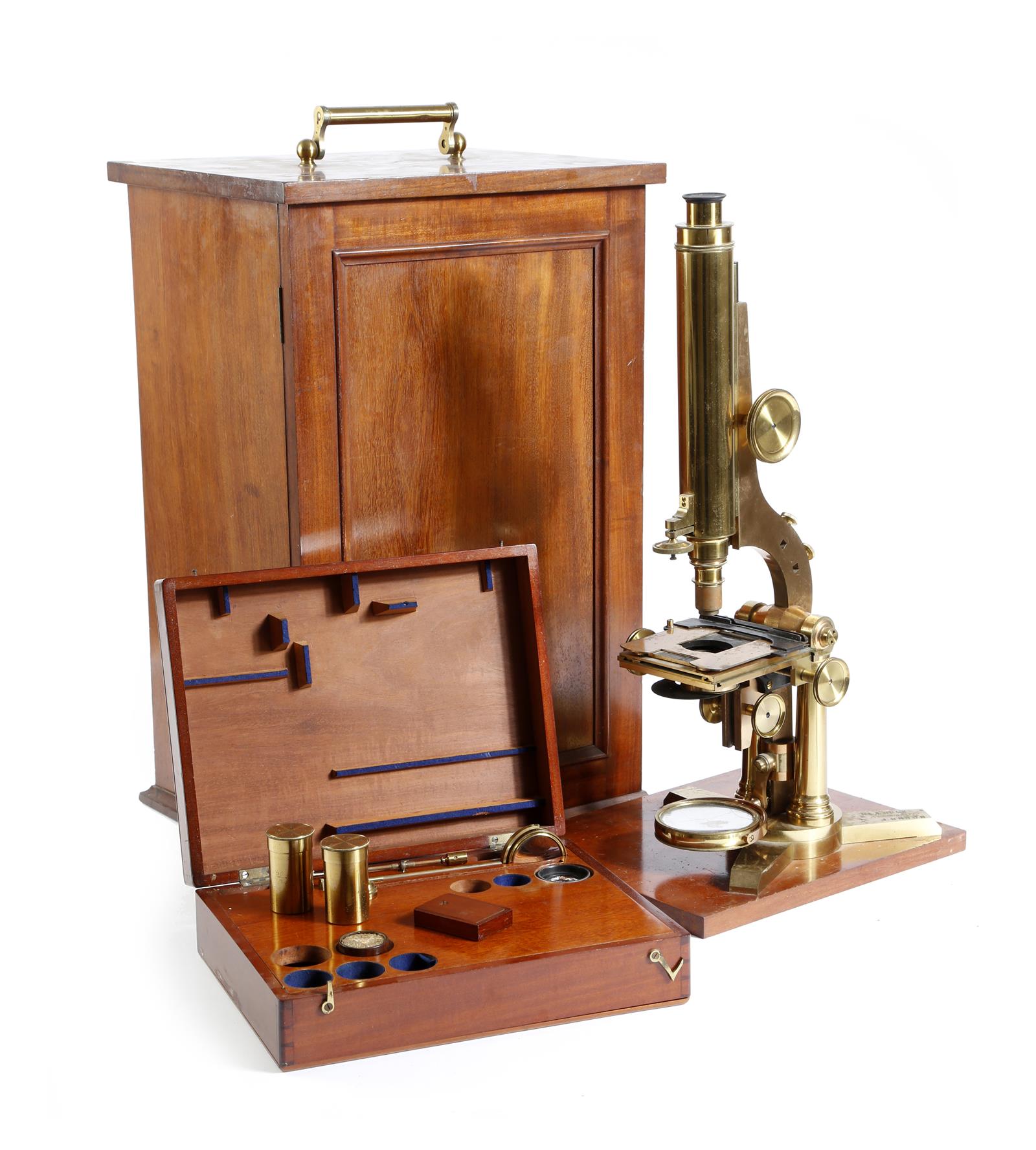 A Victorian lacquered brass monocular microscope by R & J Beck, with rack and pinion fine focusing above a square mechanical stage, the sub stage collar above a plano/concave mirror, mounted on twin columns above a flat tripod base, inscribed 'R & J Beck, 31 Cornhill, London' and numbered '6046', on a mahogany plinth, 48cm high, in a mahogany case with a brass handle, fitted with a mahogany box containing lenses and other equipment.