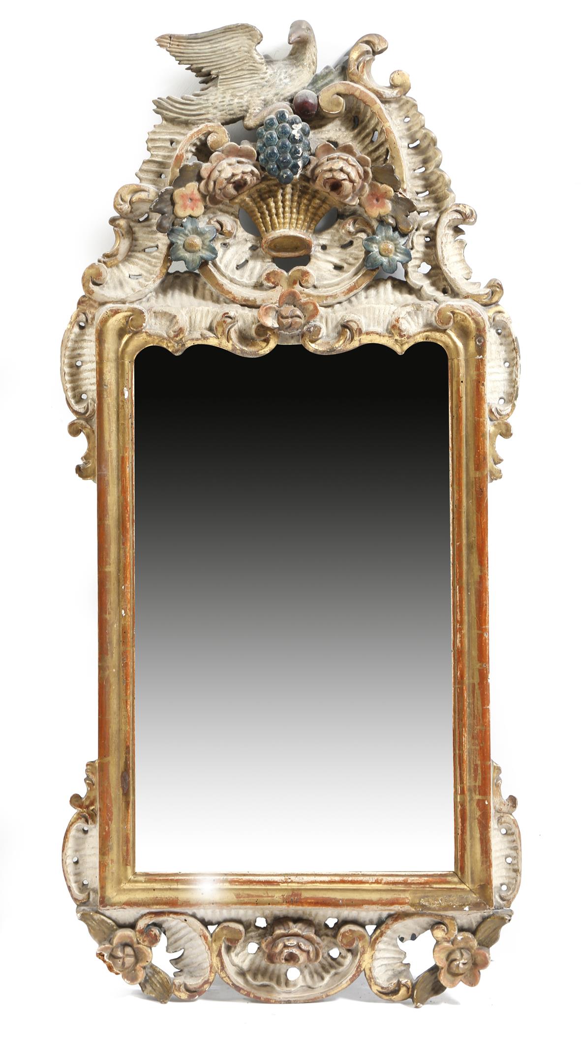 An Italian giltwood and painted Rococo style wall mirror, the plate within a moulded frame, the surmount with a basket of flowers and a bird, with rocaille decoration, 18th century and later, 79 x 37cm.