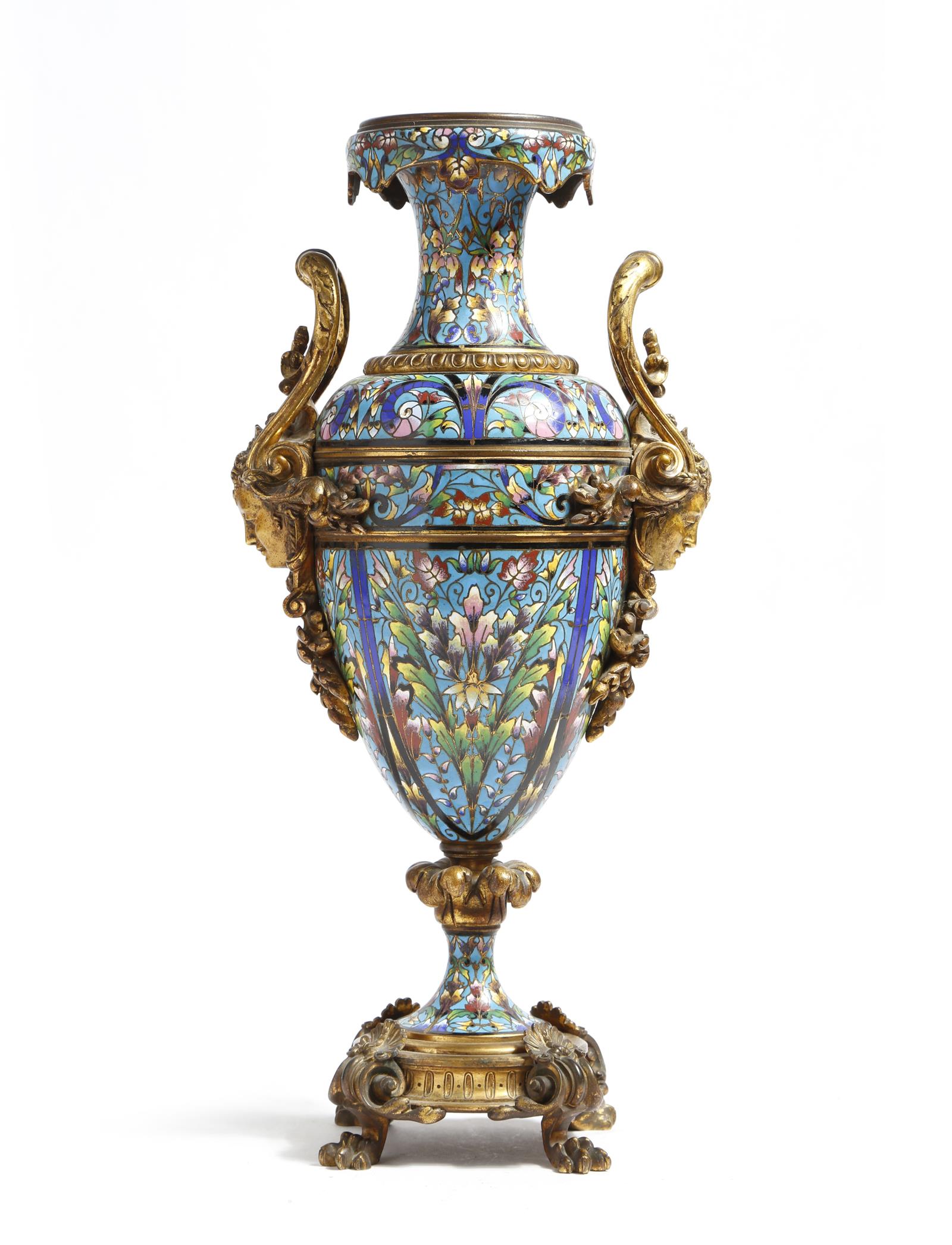 A late 19th century French ormolu and champleve enamel urn, decorated overall with scrolling leaves and flowers, with female mask scroll handles, on paw feet, 40.5cm high.