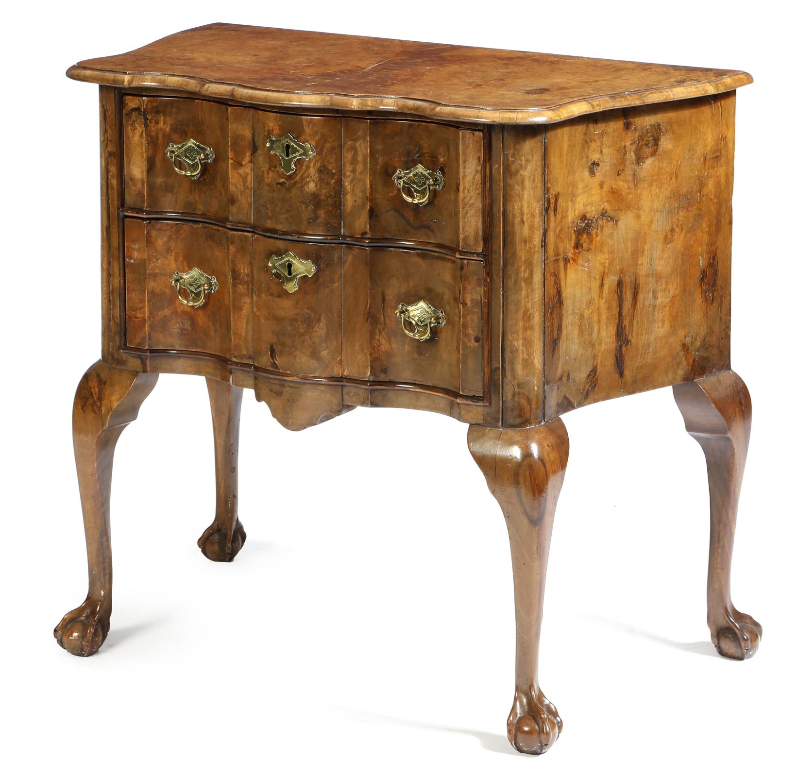 A Dutch walnut side table in 18th century style, the burr veneered top above a ripple moulded front, fitted with two frieze drawers, on cabriole legs and claw and ball feet, late 19th century, 73.5cm high, 79.5cm wide, 44cm deep.