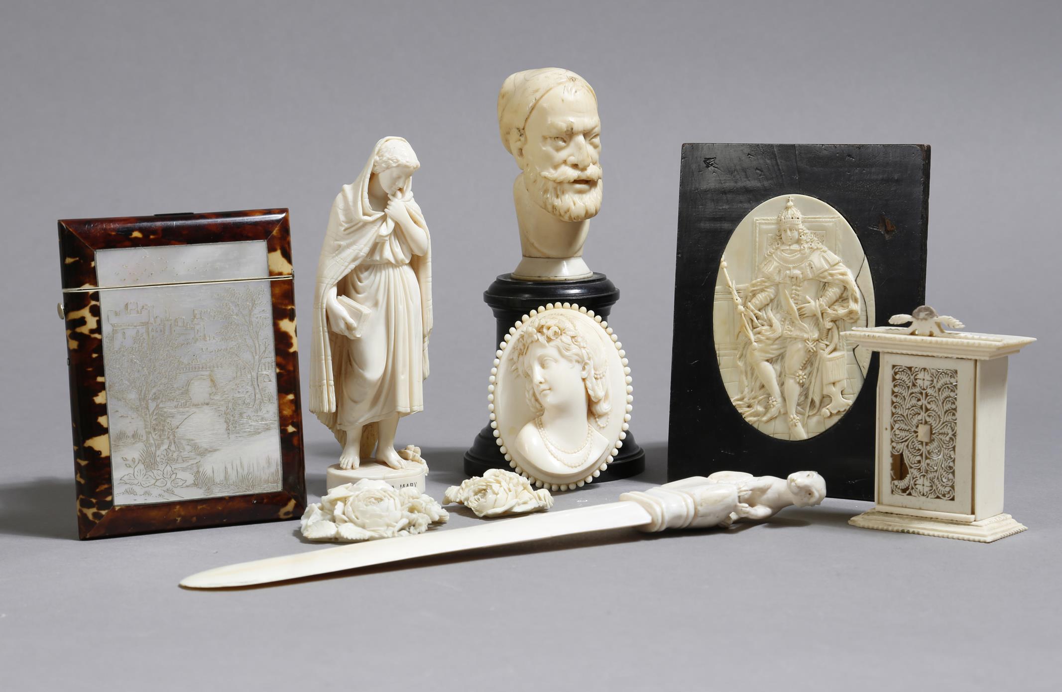 λ A late 19th century ivory figure of Highland Mary, the base titled and signed 'J. GEERCKE', together with a carved ivory bust of a bearded man on an ebonised socle, a carved ivory plaque of a king seated on his throne, two floral brooch mounts, an oval medallion bust of a lady, paper knife with a lion cub finial, a German bone doll's house cupboard and a Victorian tortoiseshell and engraved mother of pearl card case, 21.6cm (max). (9)