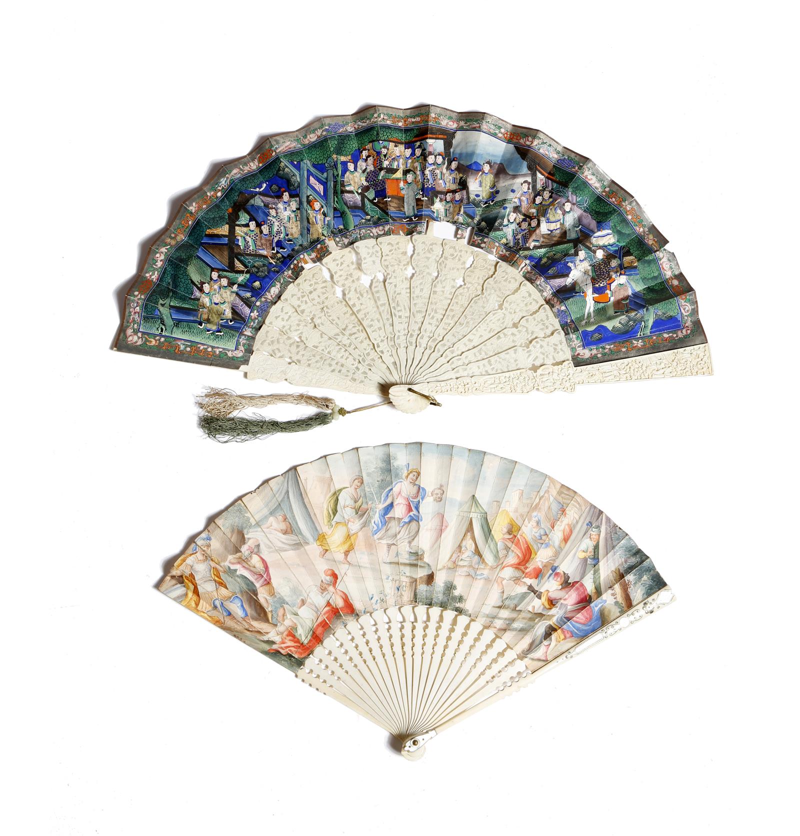 λ An 18th century Italian painted vellum fan, with bone sticks, the guards inlaid with pique work and mother of pearl, the leaf painted with a scene of Judith holding the decapitated head of Holofernes, with the city of Bethulia in the distance, 41.5cm (across), together with a 19th century Chinese export ivory and painted paper double sided fan (damages). (2)