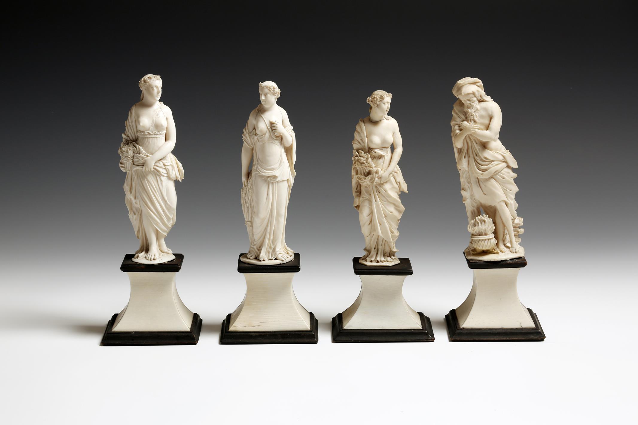 λ Four Dieppe carved ivory allegorical models of the seasons, comprising: winter as an old bearded man leaning on a tree stump beside a fire, two figures of spring, each as a classical maiden in a revealing dress, each holding a basket of flowers and summer as a similar maiden, holding sheaves of wheat, each on an ebonised and ivory waisted base, late 18th century, 27cm high (max). (4)