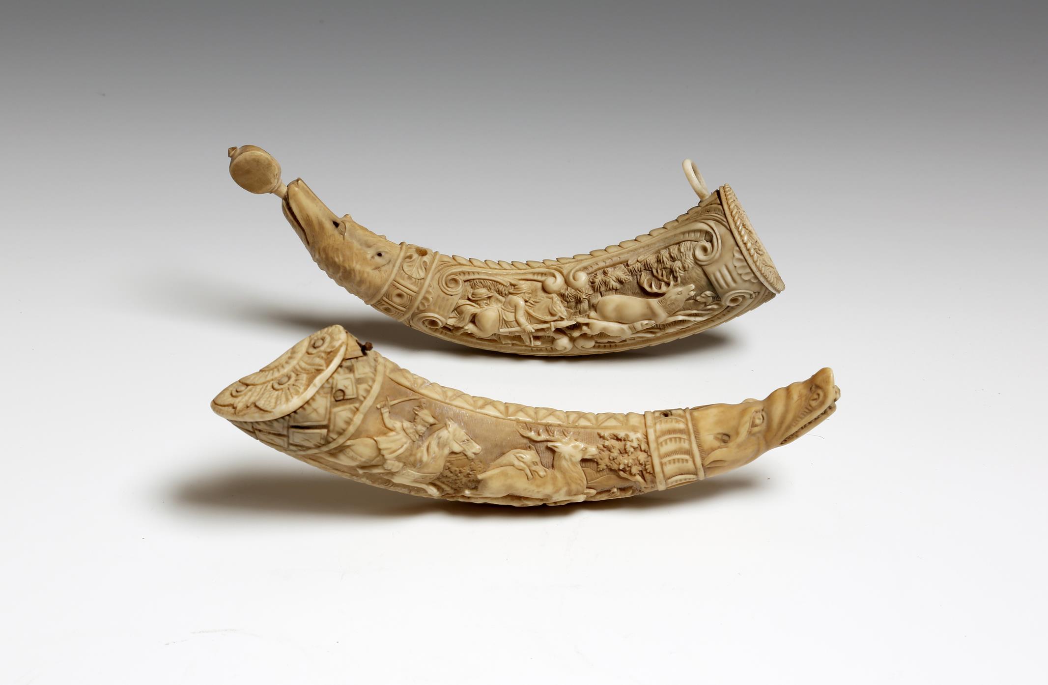 Two similar 19th century Austrian hippopotamus tooth powder horns, one carved with a stag hunt, the verso with scrolling acanthus leaves and with a coat of arms surmounted by a helm and a coronet, with a dog's head terminal and with stopper, the other also with a stag hunt, the verso with a titled portrait bust of Franz I, above a crown and a cartouche with three fleur-de-lis, with a boar's head terminal, 18.2cm long (max). (2)