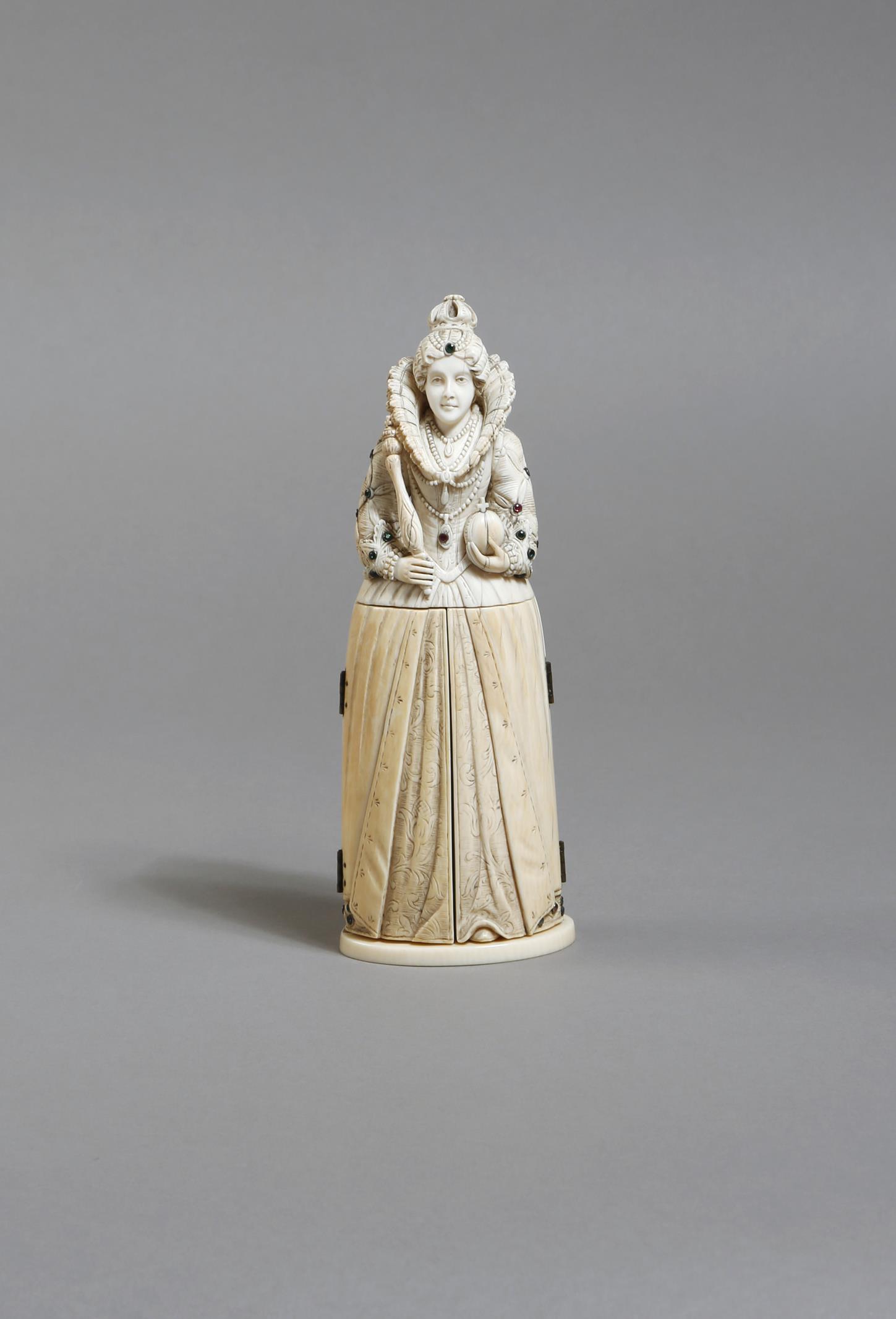 λ A late 19th century French Dieppe carved ivory and jewelled triptych figure of a Queen