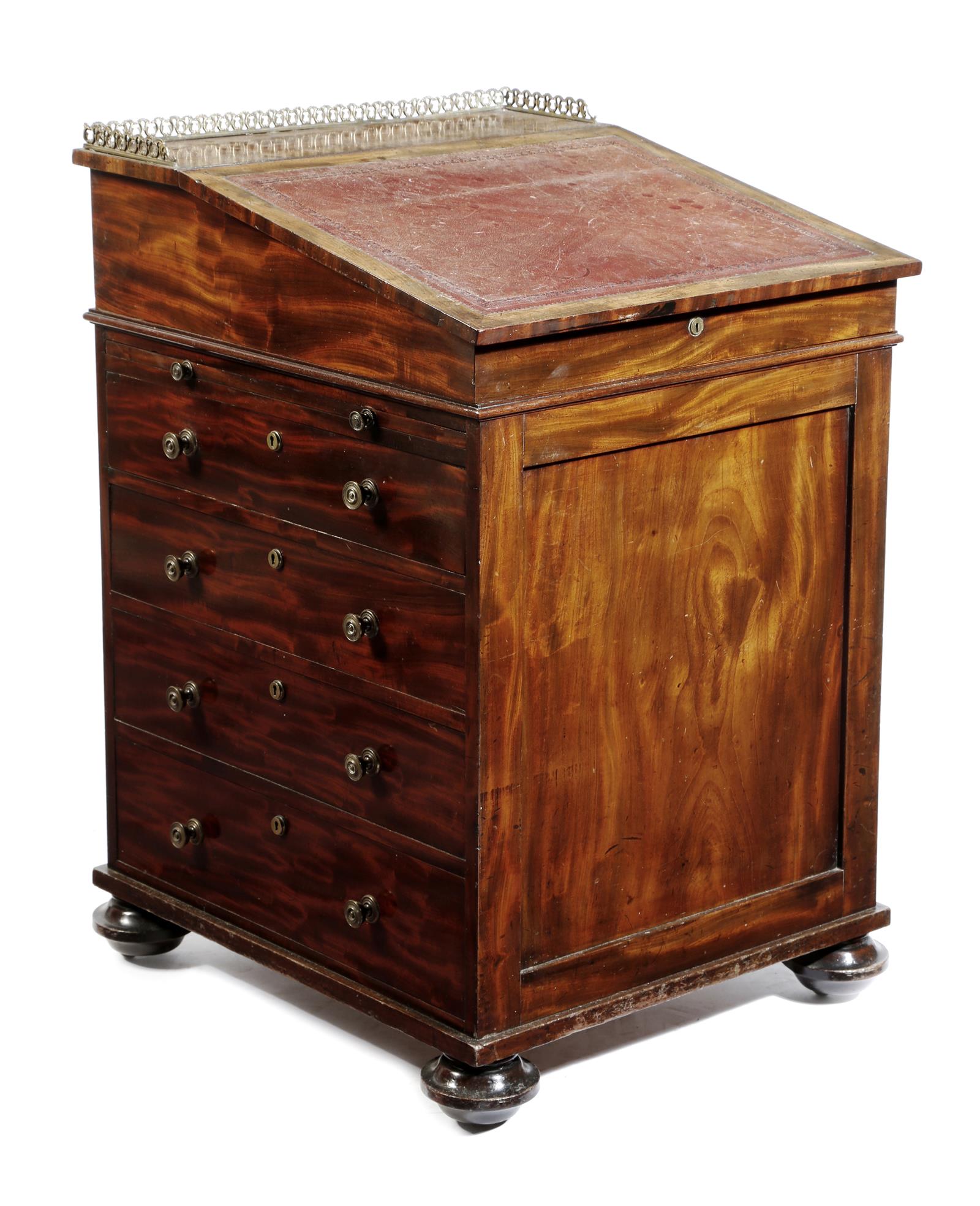 A George IV mahogany Davenport in the manner of Gillows, the sliding top with a brass gallery, above a hinged leather lined writing slope, revealing a drawer and a secret drawer, the right side with a hinged pull-out inkwell and pen compartment, above four long graduated drawers, the left side with a pull-out leather lined slide, on sunken brass castors, 86.3cm high, 57.5cm wide, 62.5cm deep.