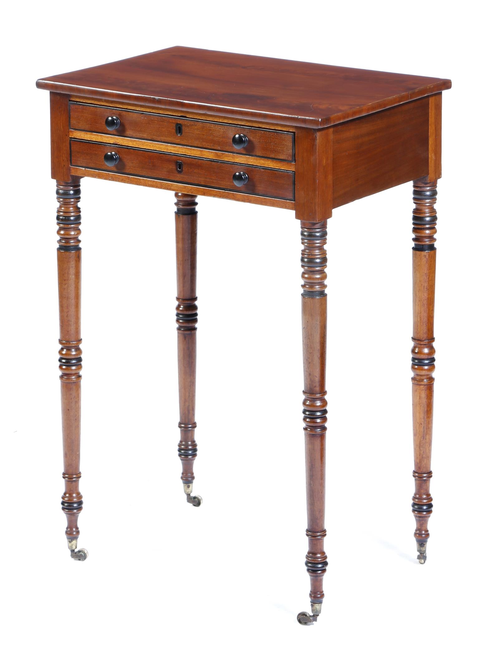A Regency mahogany occasional table, with ebonised stringing and fitted with two drawers, on brass castors, 75.7cm high, 50.4cm wide, 35cm deep.