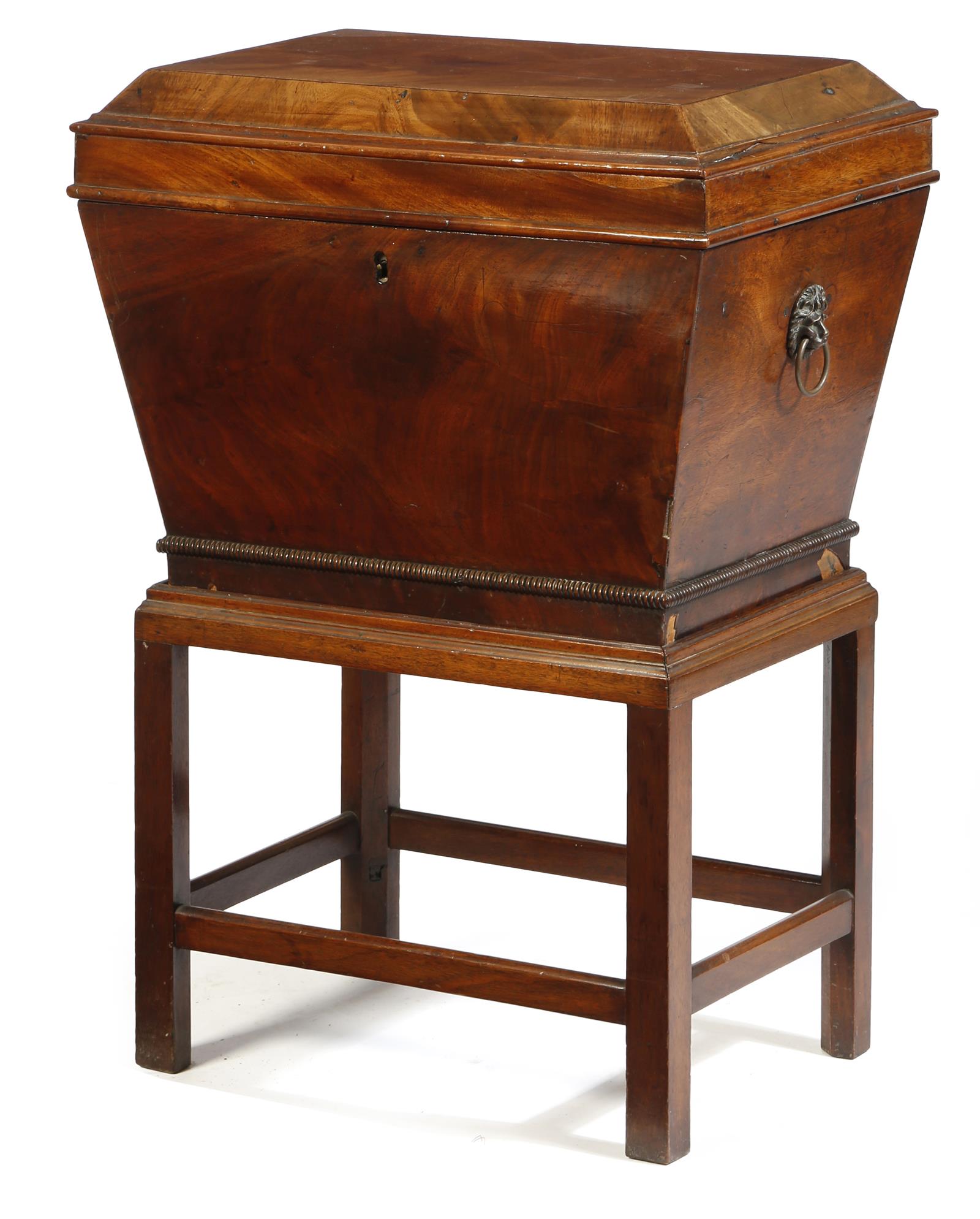 A William IV mahogany sarcophagus on stand, the hinged lid revealing an interior with three tin pull-out canisters, flanked by a pair of bins with pierced bases and slide-out undertrays, with later side handles, with nulled decoration and on an associated stand, 72.4cm high, 50.2cm wide, 34.5cm wide.
