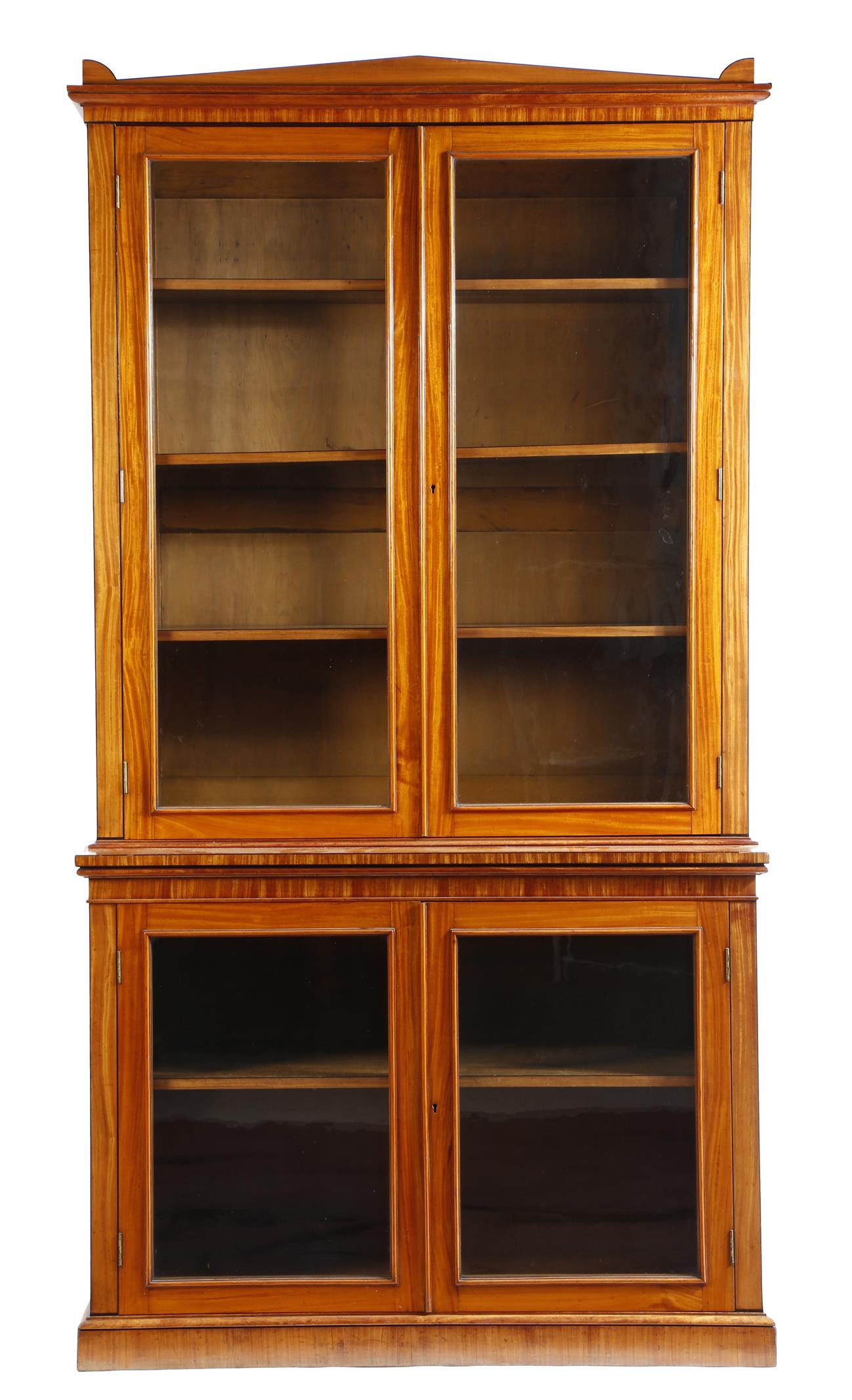 An early 19th century satinwood bookcase cabinet, inlaid with ebonised stringing, the detachable classical pediment above a pair of glazed doors, enclosing three adjustable shelves, the conforming base with a single shelf, 208.5cm high, 112.4cm wide, 44.5cm deep.