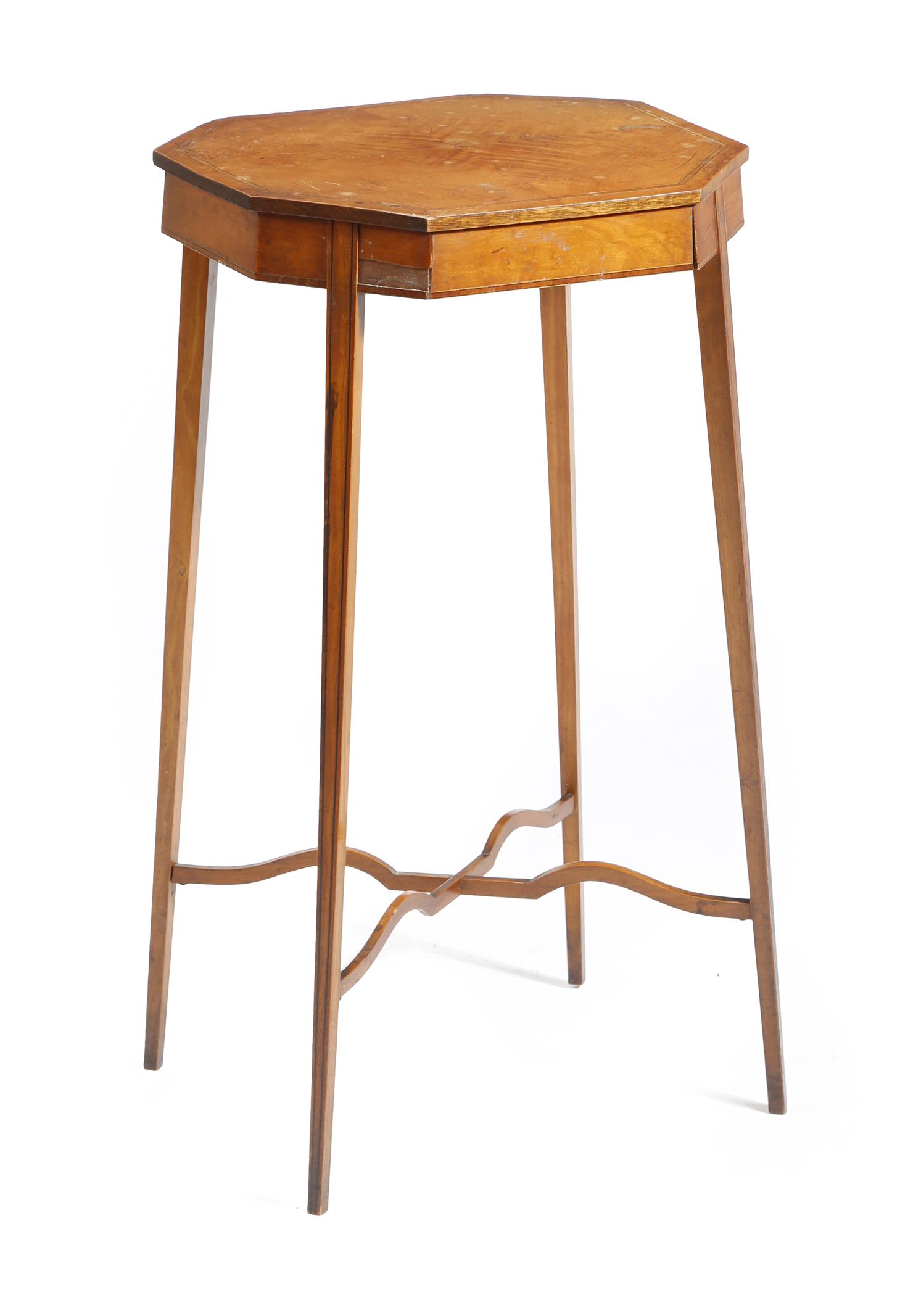 A 19th century satinwood lamp table, the quarter veneered top with canted corners, on square tapering legs inlaid with ebonised stringing, 73.5cm high, 40cm wide, 34.5cm deep.