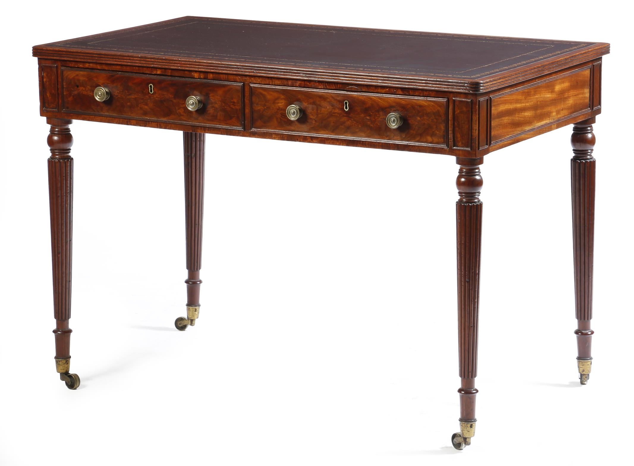 A George IV mahogany writing table attributed to Gillows, the top with a reeded edge and inset with gilt tooled leather, above a pair of frieze drawers, flanked by tablet panels, on turned and ribbed tapering legs and brass castors, 75.2cm high, 107.1cm wide, 60.6cm deep.