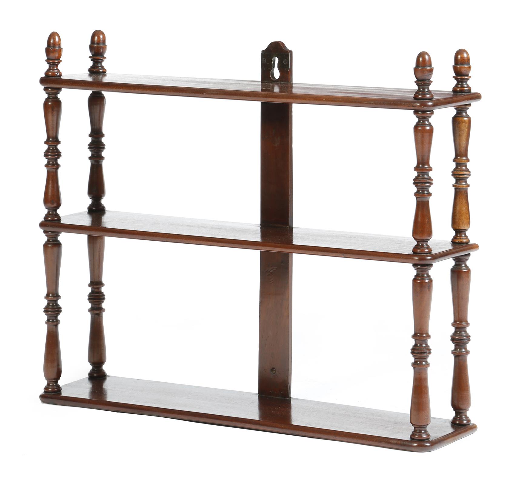 A set of Regency mahogany hanging wall shelves, with acorn finials and turned supports, 57cm high, 68cm wide, 15.6cm deep.
