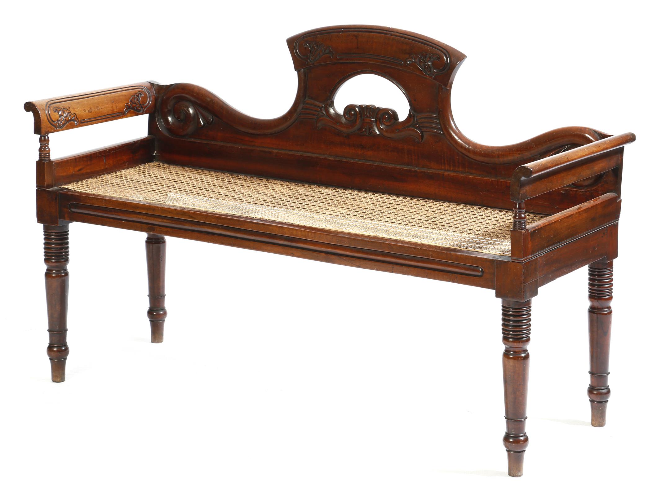 A late Regency goncalo alves hall bench in the manner of Gillows, the shaped back carved with scrolls and lappets, with a squab cushion above a cane seat, on disc turned tapering legs, 74cm high, 116.8cm wide, 40.3cm deep.