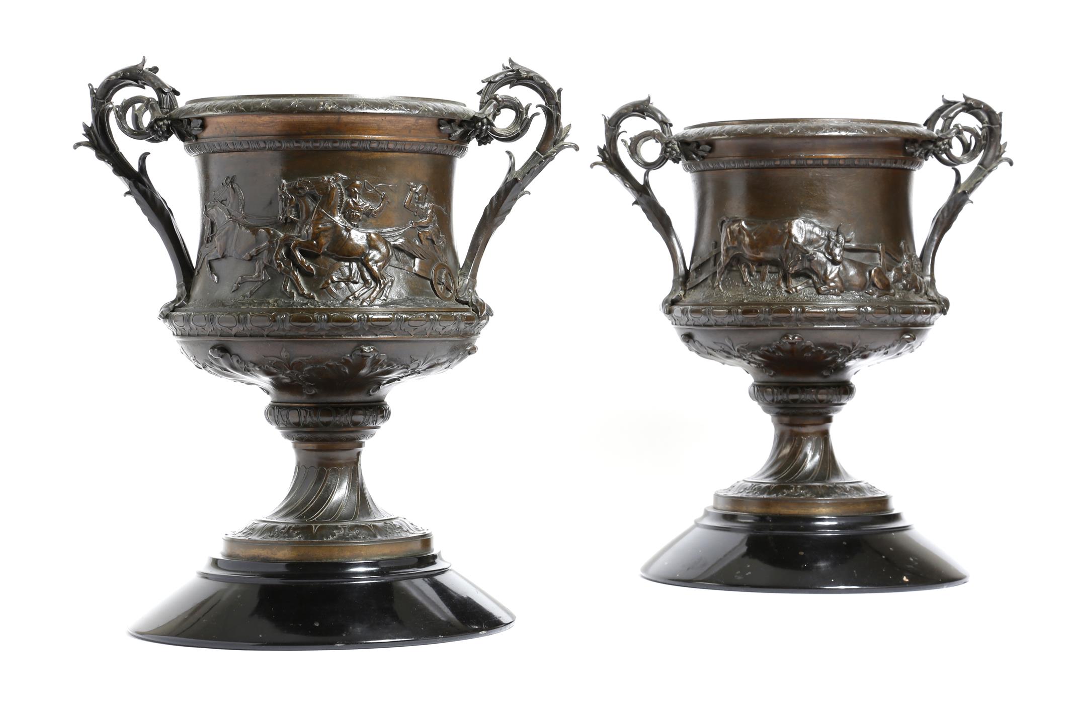 Isidor-Jules Bonheur (French 1827-1901). A pair of bronze urns, the bodies relief decorated, one with cattle working and in repose the other with scenes with horses racing and pulling a chariot, signed 'I. BONHEUR', with scrolling leaf handles, stamped 'PEYROL' foundry mark and on polished black marble plinths, with removable liners, 36.1cm high. (2)