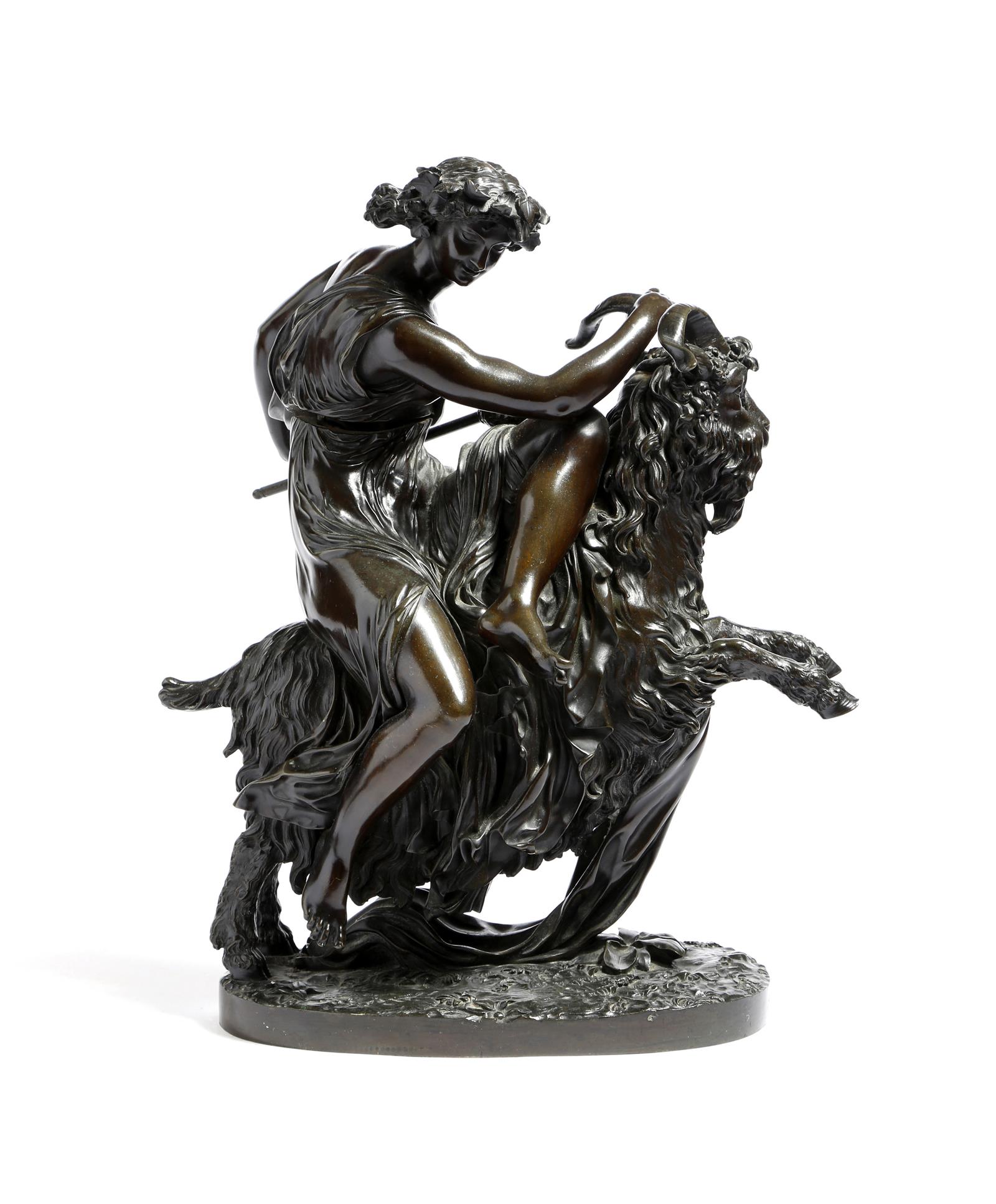 A 19th century French bronze group of a classical lady riding a goat, on a naturalistic base, 41cm high.