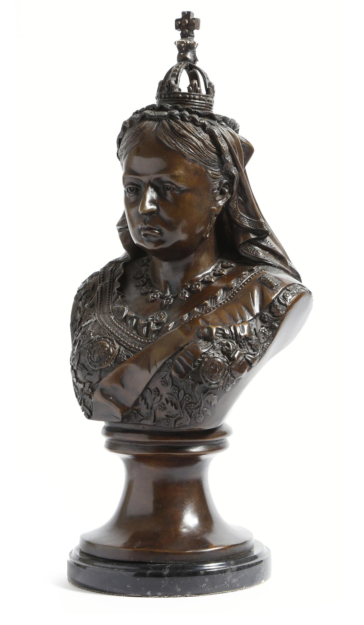After Sir Joseph Edgar Boehem (1834-1890). A modern bronze bust of Queen Victoria, on a black marble plinth, 40.5cm high.
