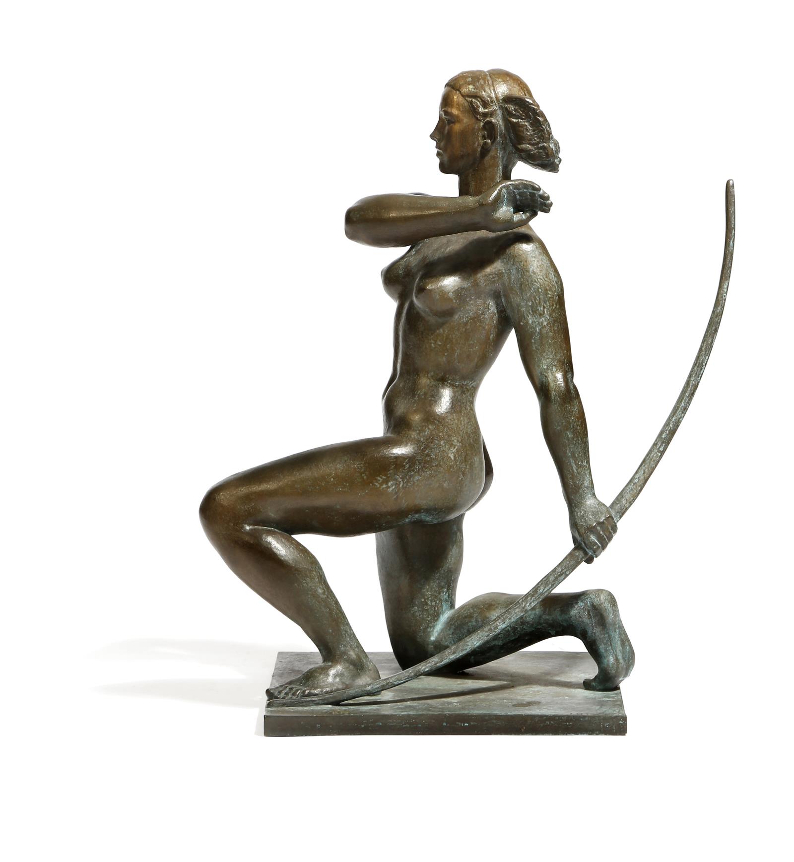 ‡ Axel Poulsen (Danish 1887-1972). An Art Deco bronze figure of Diana, kneeling holding her bow, the plinth base signed and dated 'AXEL POULSEN 1942', 62cm high.