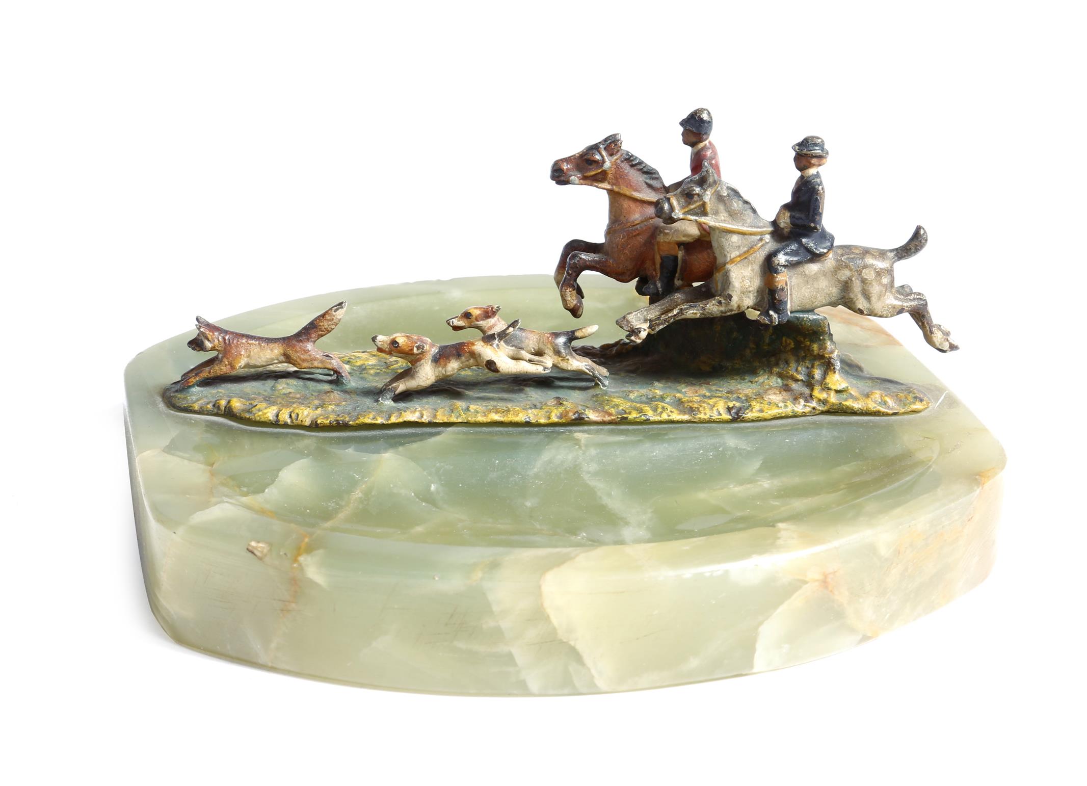 An Austrian cold painted bronze hunting group, of two horses and riders, with dogs chasing a fox, mounted on an onyx base, early to mid-20th century, 14.5cm wide.