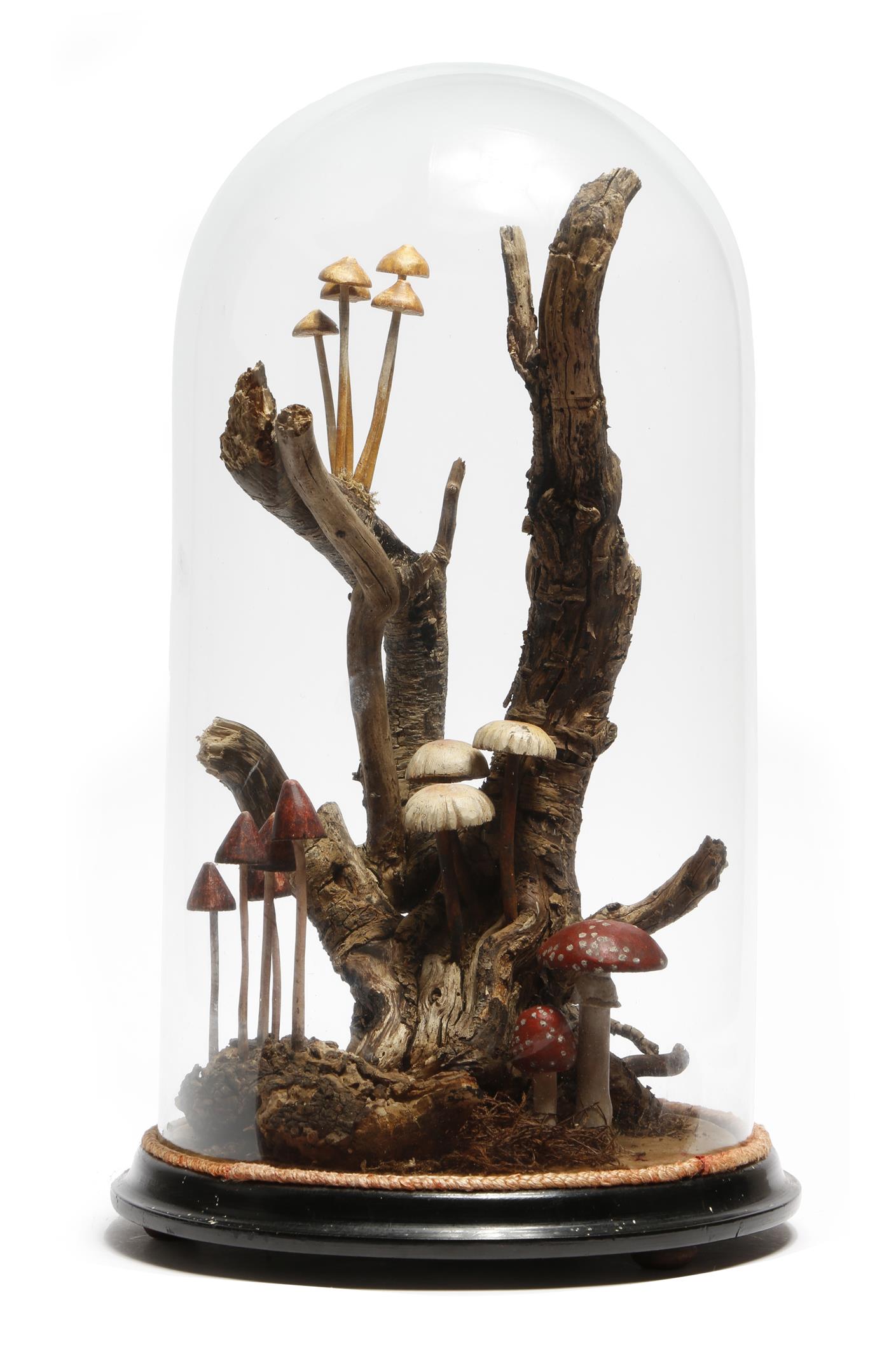 A Victorian display of carved wood and painted mushrooms, in a naturalistic tree trunk setting, on an ebonised base and under dome, 43.2cm high.