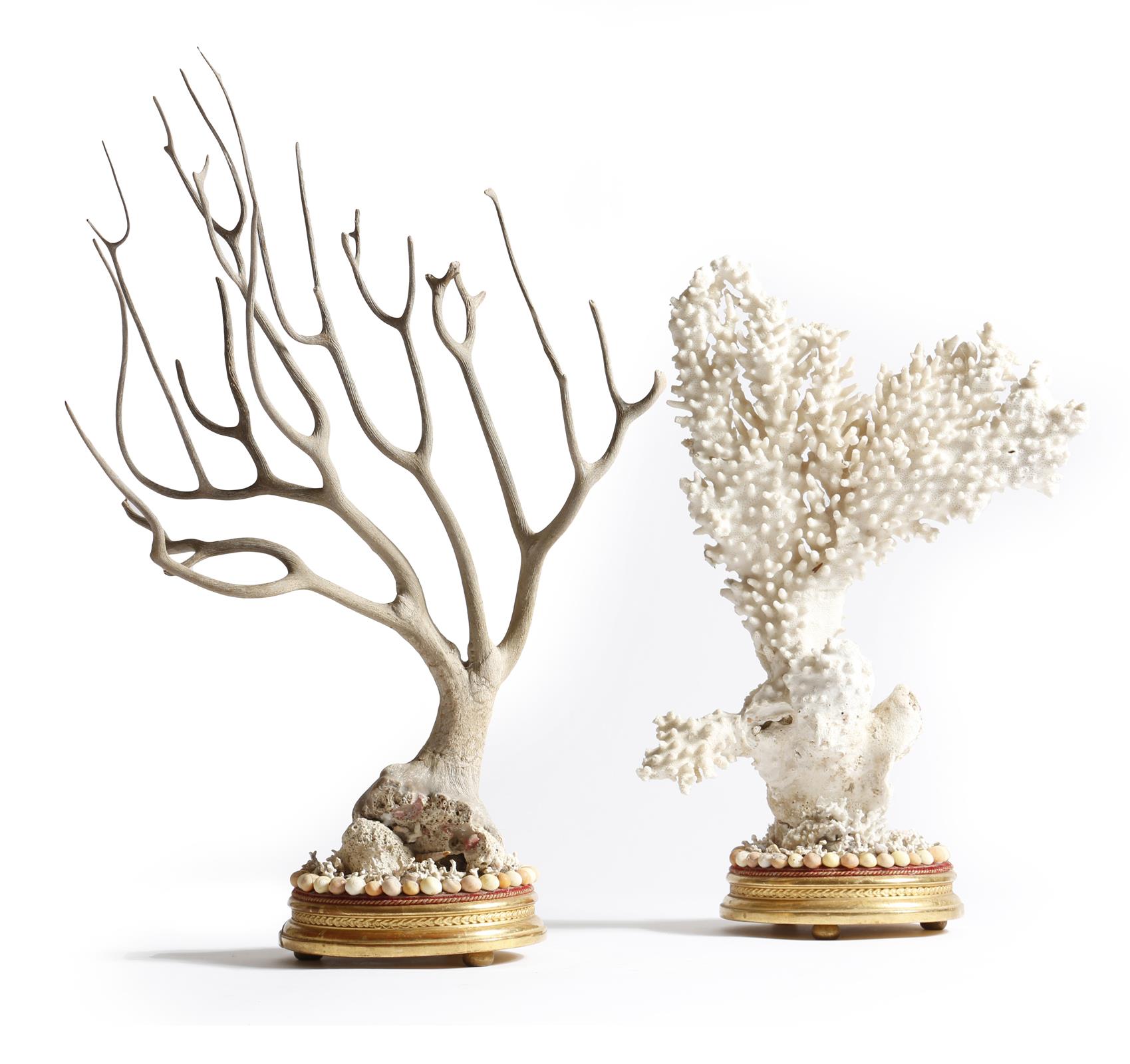 λ Two Victorian coral specimen groups, each mounted on a shell encrusted giltwood base, the undersides stamped 'DS 3810', 52cm high (max). (2)