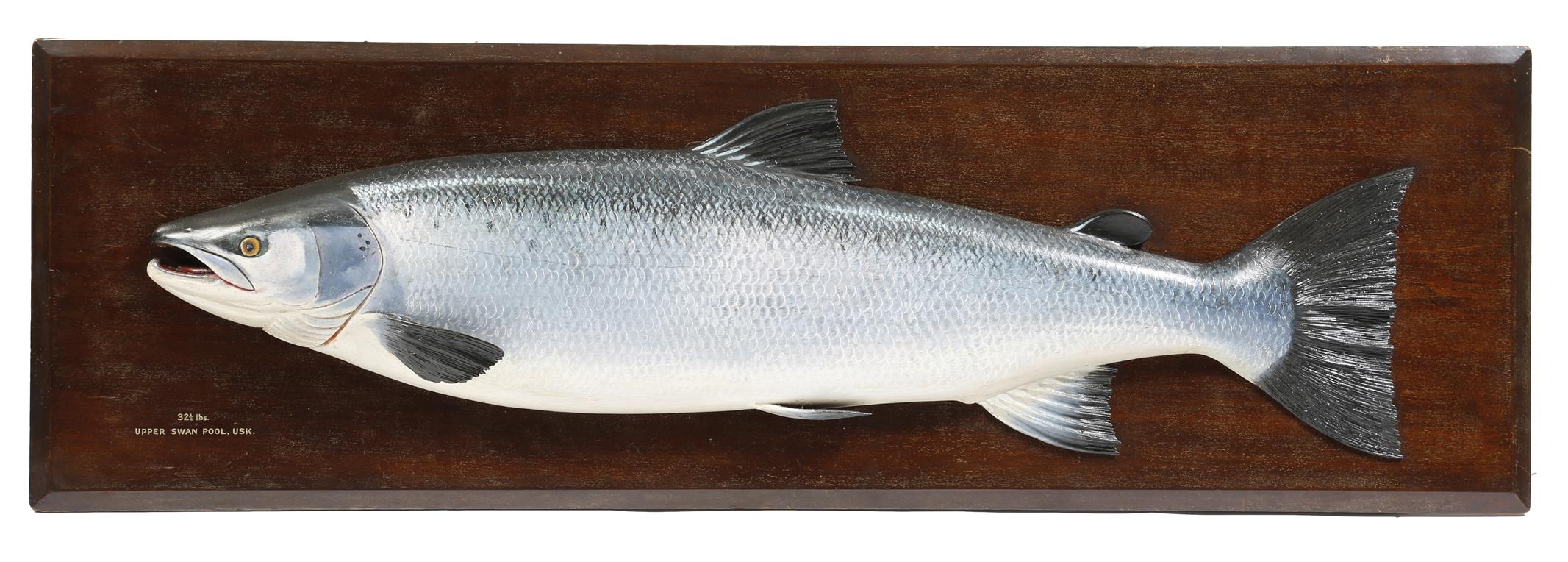 An Edwardian carved wood and painted half-block model of a salmon by Charles Farlow & Co., mounted on a mahogany plaque, inscribed '32 and 1/2 lbs. UPPER SWAN POOLE, USK.', the verso with a Farlow stencil mark 'C. FARLOW & CO. LD FISHING ROD MANUFACTURERS, 10 CHARLES ST. ST. JAMES SQ. S. W. LONDON', 43 x 137.2cm.
