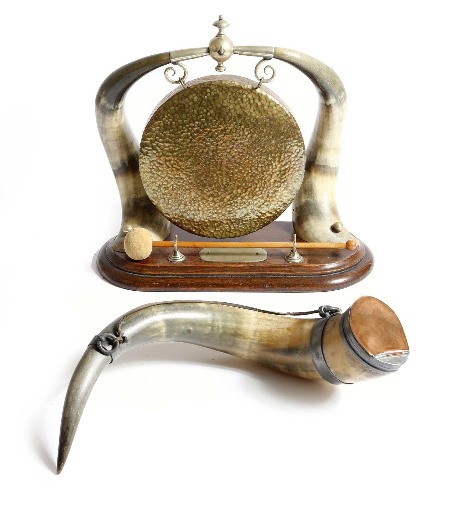 A late Victorian oak and horn table top gong, with plated mounts, 36.8cm high, together with a horn snuff flask, with a hinged pewter lid. (2)