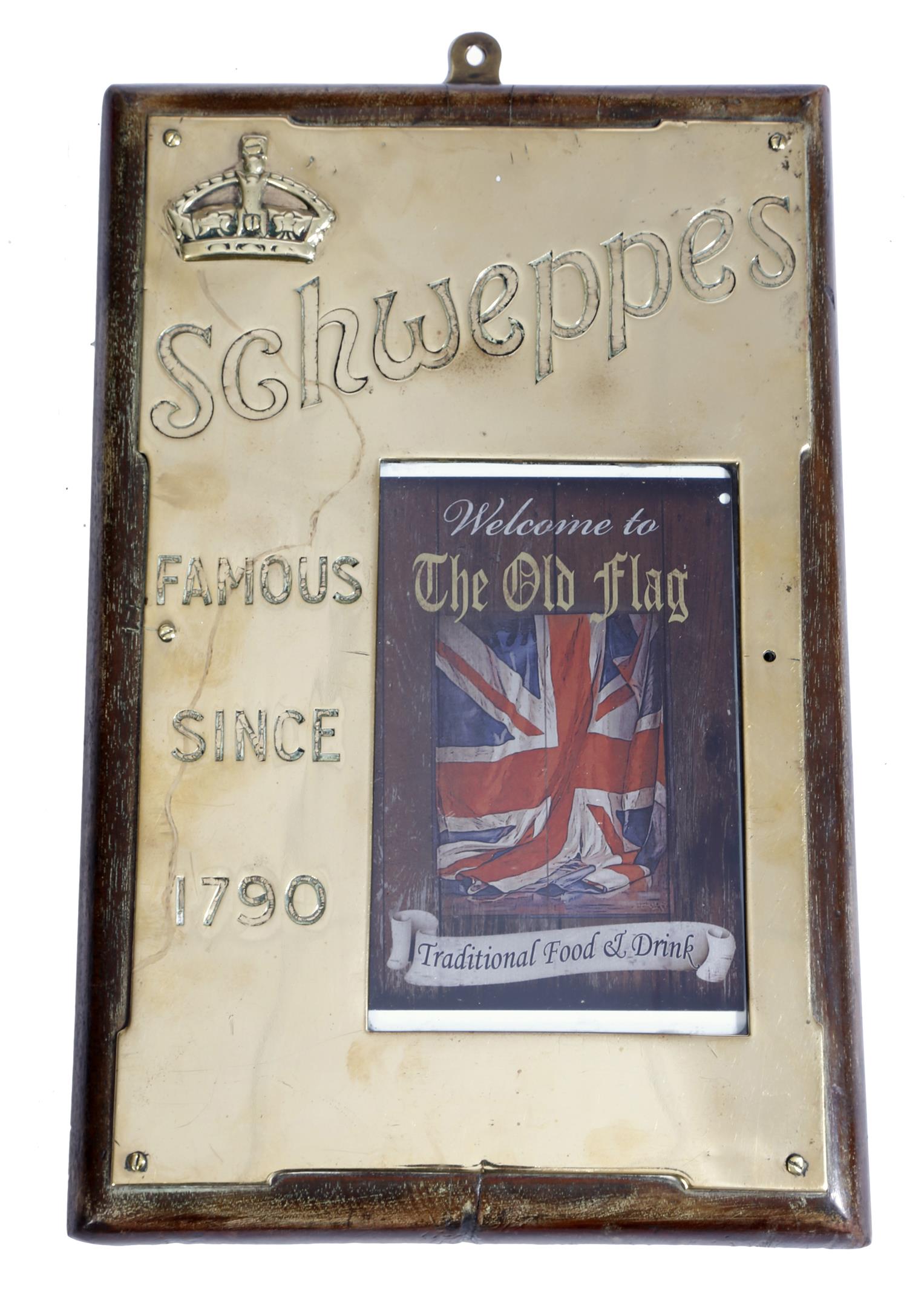 A mahogany and brass Schweppes advertising sign, inscribed 'Schweppes FAMOUS SINCE 1790', 44.8 x 28.8cm.
