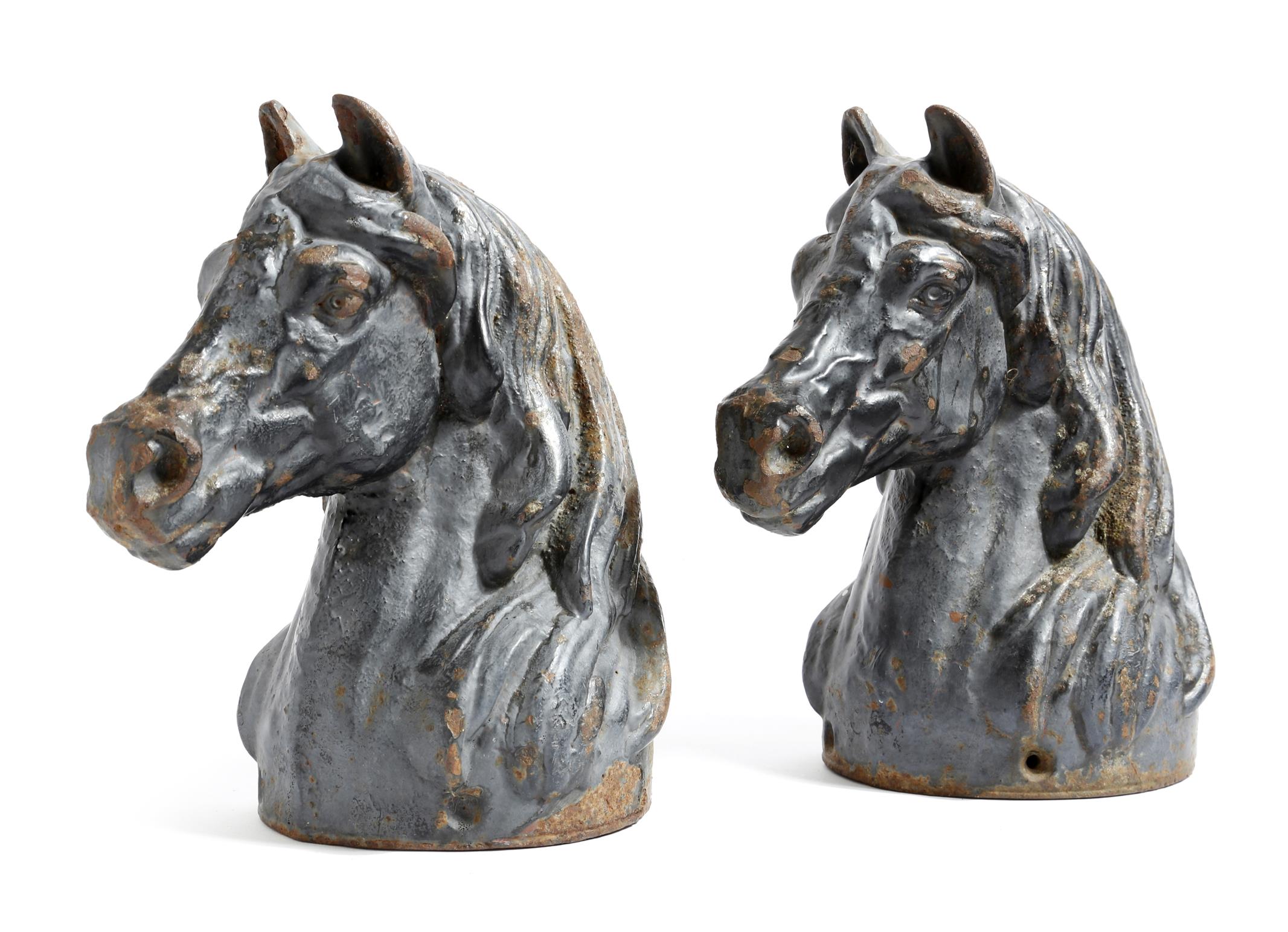 A pair of Victorian cast iron horse tethers, in the form of a horses' head, painted black, 27cm high. (2)